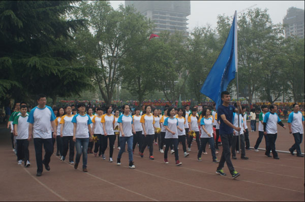 开幕式正式开始后,放眼望去,塑胶场地上,来自各个学院的方队像即将踏上征途的士兵,等待着检阅。在院长冯建新教授和副院长窦文阳老师的带领下,三公