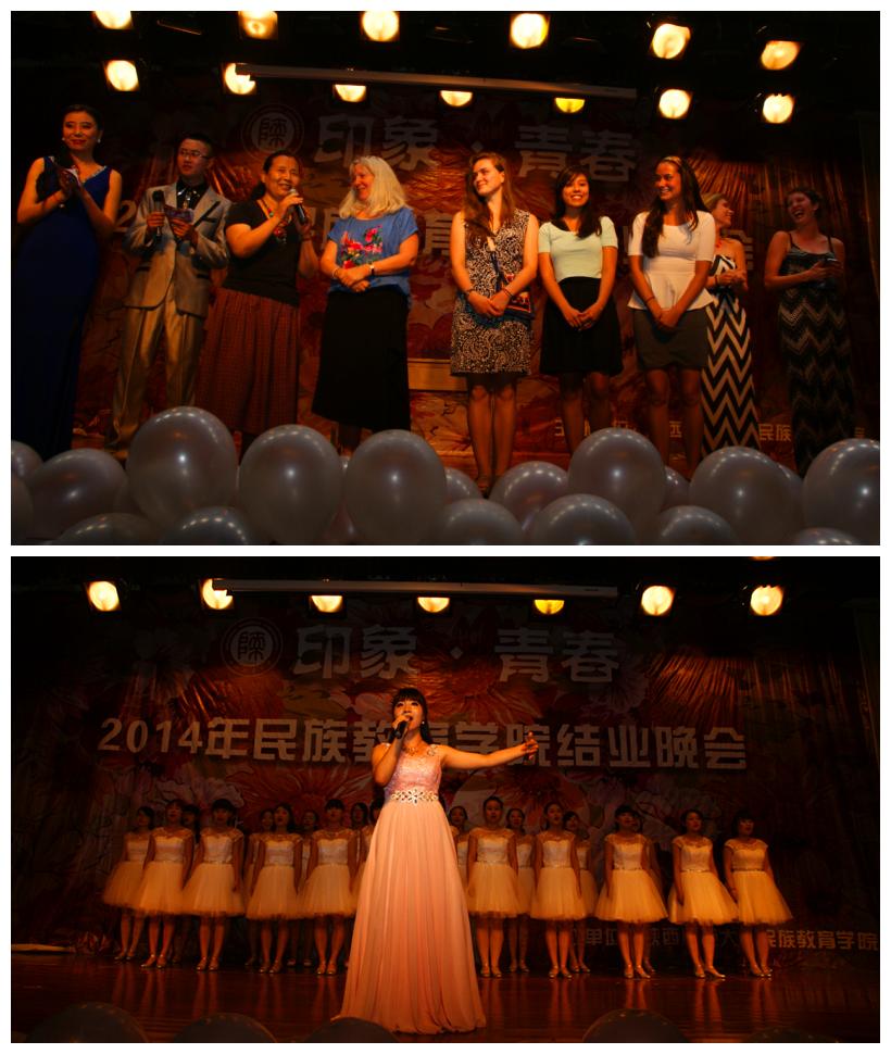 这一场晚会还邀请到了一位特别来宾,一位从美国而来,到师大交流学习的老师Margaret Hawkins,当天恰逢老师的生日,为她准备了小小的惊喜,送上了一首动听《一杯美酒》。精彩的节目依然在继续,由7位帅气的女生为我带来的舞蹈《青花瓷》,将原本温如尔雅的一首歌演绎的帅气十足。要说晚会最能勾起离别情绪的就是新疆同学带来的《离别的日子》和音乐剧《岁月流声》,在场的观众不少都落泪了。最后,晚会在一首合唱《送别》中拉下了帷幕。