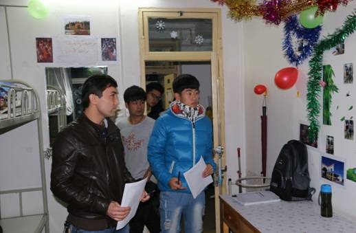 学本科预科辅导员热依木及各班班主任带领学生会主席团以及生活部部长、副部长,对我院学生宿舍用电安全、宿舍卫生以及宿舍文化创意进行检查。各辅导员以及学生会代表们本着“公平、公开、公正”的原则认真为各宿舍评分,各宿舍学生也积极配合宿舍用电安全、宿舍卫生和宿舍文化创意进行细致检查。