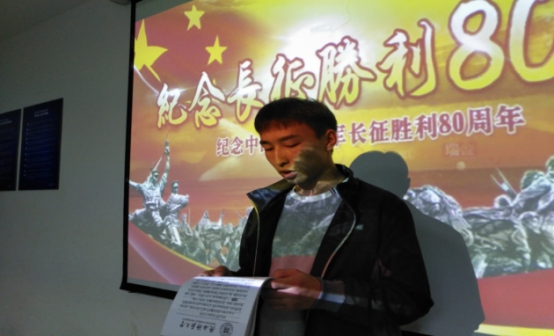 10月22日下午,我院组织预科二班全体学生在9号教学楼继续学习长征精神。活动开始,同学们在团支书孙丽婷的带领下一起阅读了《丰碑》等长征故事。随后,全体同学观看了《左力,一个人的长征》视频,纪录片导演,著名摄影家左力先生说:“有人说红军已经死了。我觉得红军就在路上,就在老百姓心中,就在升起的袅袅炊烟之中。有时候,行路前老乡会悄悄在我包里塞上馒头和橘子,太令我动容了。红军没有死,老百姓心里还装着红军呢!”观看后谈及感受,田杰同学说:“在长征中,党和红军经历了常人难以想象的磨难,他们战胜了困难,将这些可贵的精神财富留给了我们,他们用亲身经历向我们诠释了长征精神的含义,在当今社会中,我们更应该发扬长征精神,并赋予它新的内容,为它注入新的活力,在学习工作和生活中艰苦奋斗。”此外,活动中还开展了长征知识问答比赛,比赛中同学们积极参与,热情洋溢,共同学习红军长征历程。