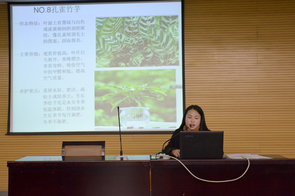 民硕三班的姚潍(侗族)在崇鋈楼二层闻道堂进行了以“室内观赏植物的作用与选择”为题目的植物讲座。姚潍通过播放幻灯片和影音视频,分别从室内观赏植物的种类、作用、选择、培育方法、内景布置等方面做了详细的的介绍。并通过大量的图表、数据向同学们说明在室内种植绿色植物的重要性,它不仅能进化室内空气,而且还能有效的缓解眼睛疲劳,同时列举了10种室内最易栽培的绿色植物推荐给大家。提问环节将讲座推向高潮,同学们争先恐后踊跃的回答各种关于培养室内植物问题,并通过室内盆栽现场指认的方式让通过学们更加了解室内花卉,扩大了学习视野。最后为答对问题的同学送上了精美植物小盆栽。