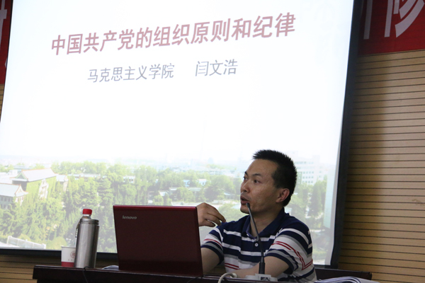 培训中,闫文浩老师以党的根本组织制度和领导制度为引领,结合同学们日常学习工作内容,勉励大家在生活中努力学习,做到沟通协调,多听取他人意见,做到严以律己,正确处理好个人与集体的关系,贯彻好、落实好党的群众观点、群众路线,以人民利益为重,实现好、维护好最广大人民群众的根本利益,不能让思想留在纸上,而是要切实的深入精髓,贯彻学习,指导行为。随后,闫文浩老师详细地为大家讲解了党的纪律和党的规矩,做为学生要自觉维护学风、校风、舍风、班风,并例举了自十八大以来党内开展的各项教育实践活动,要求同学们认真学习习近平总书记系列重要讲话精神,发扬中国共产党的三大优良作风。最后,闫文浩老师详细讲解了《中国共产党廉洁自律规则》和《中国共产党纪律处分条例》,同时图文并茂地例举了老一辈革命家们自觉遵守廉洁纪律的故事,提醒同学们警惕苏联解体地历史教训和历史的虚无主义。希望同学们在生活中严格要求自己,注意自身的网络言论,勤俭节约不奢靡。