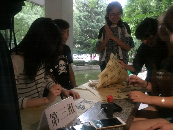 本期“一书一世界,墨香满长安”读书交流会以户外交流的方式来进行。第一环节中大家畅所欲言,读书爱好者们分享各自的读书方法,相互介绍已阅读书籍,同时各小组代表上台向大家分享了自己小组读书经验。随后在第二环节中,每组在五分钟之内提笔写出了对于人生、梦想以及书籍的感悟。大家拿起项目组准备好的毛笔在纸上写出了自己对人生的感悟,对未来的憧憬,在每组写完之后,评委按照字体的整齐性和内容的积极性等方面做出评分。最后,主持人对这次活动做出了总结,活动负责人给每个小组颁发了奖励品。
