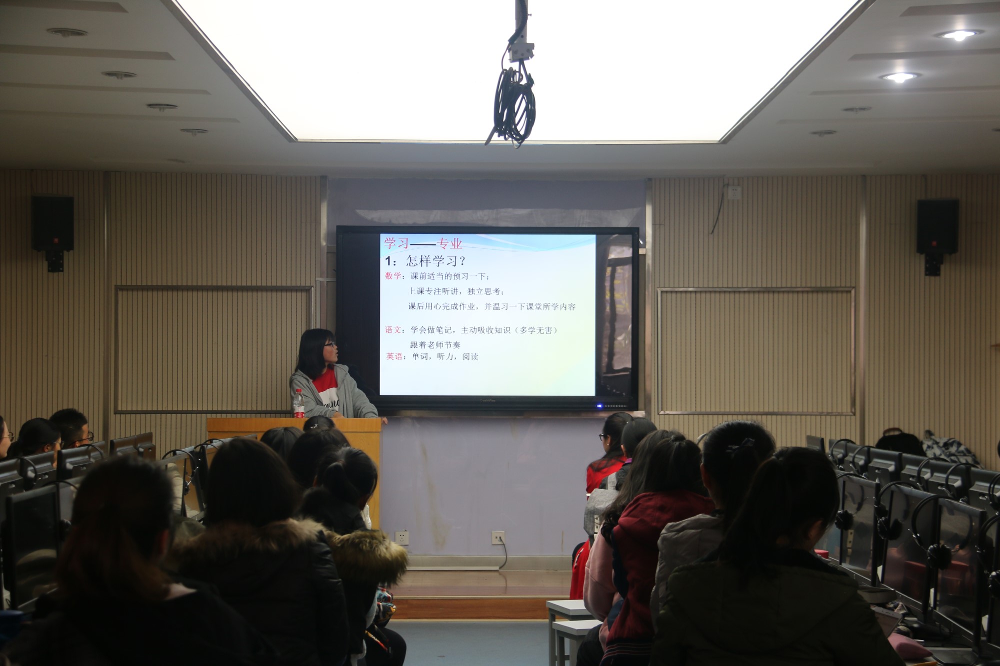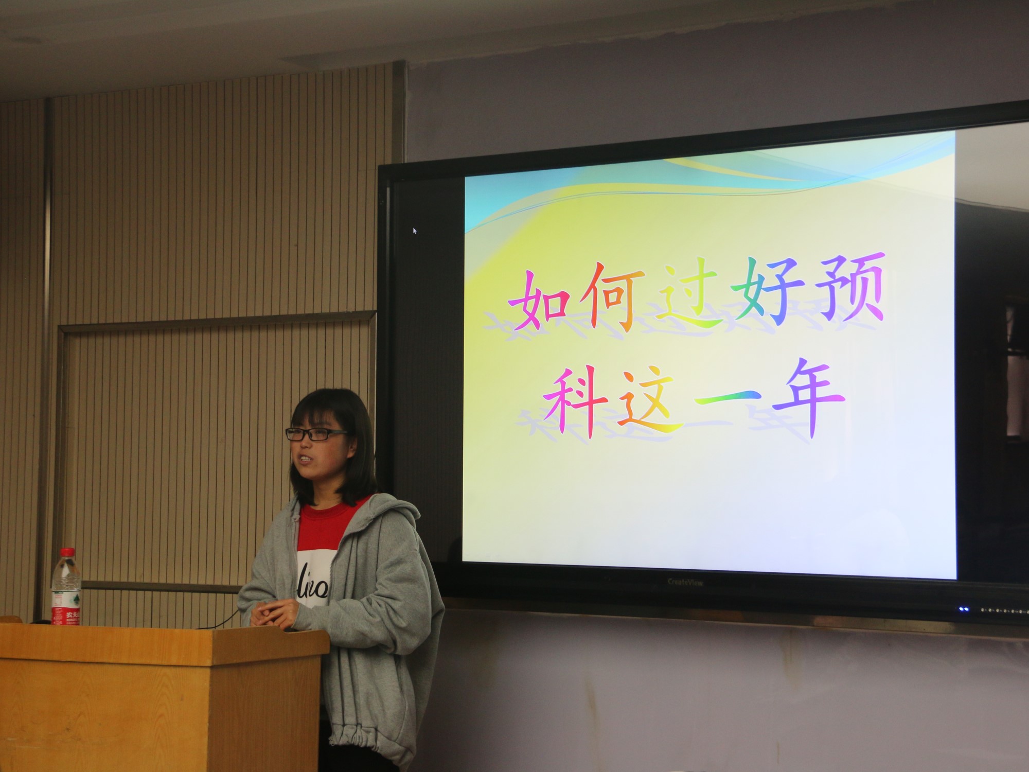 班会最关键的部分是2016级预科生姬红霞的精彩分享,她质朴无华的语言,生动形象的讲说,丰富充实的内容,殷切期盼的关怀,深深地打动了在场的每一位同学。她从学习和生活两方面展开了讲述,学习上细致到每一门学科的学习方法和经验交流,生活上涉及到日常生活和同学交往方面,每一字一句都贴近实际,说到了同学们的心坎上。到了解答疑惑环节时,将场面引向了高潮,同学们畅所欲言,踊跃提问,学姐认真倾听,虚心解答,其中马扬,党占全,兰燕,周雨欣,杨玥等同学分别讲出了自己在这大半学期中遇到的困惑与疑问,在姬红霞的帮助下,他们找到了答案。