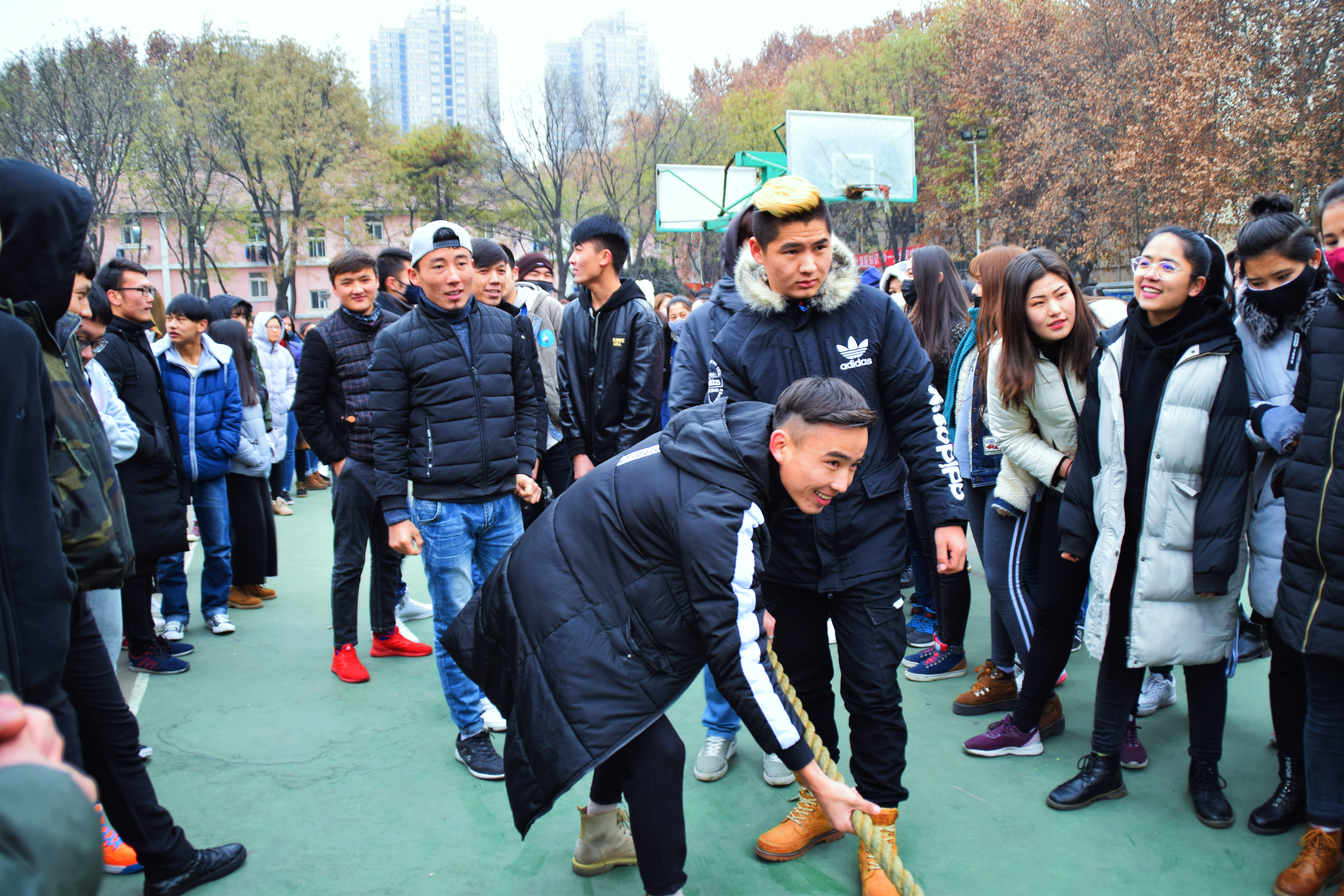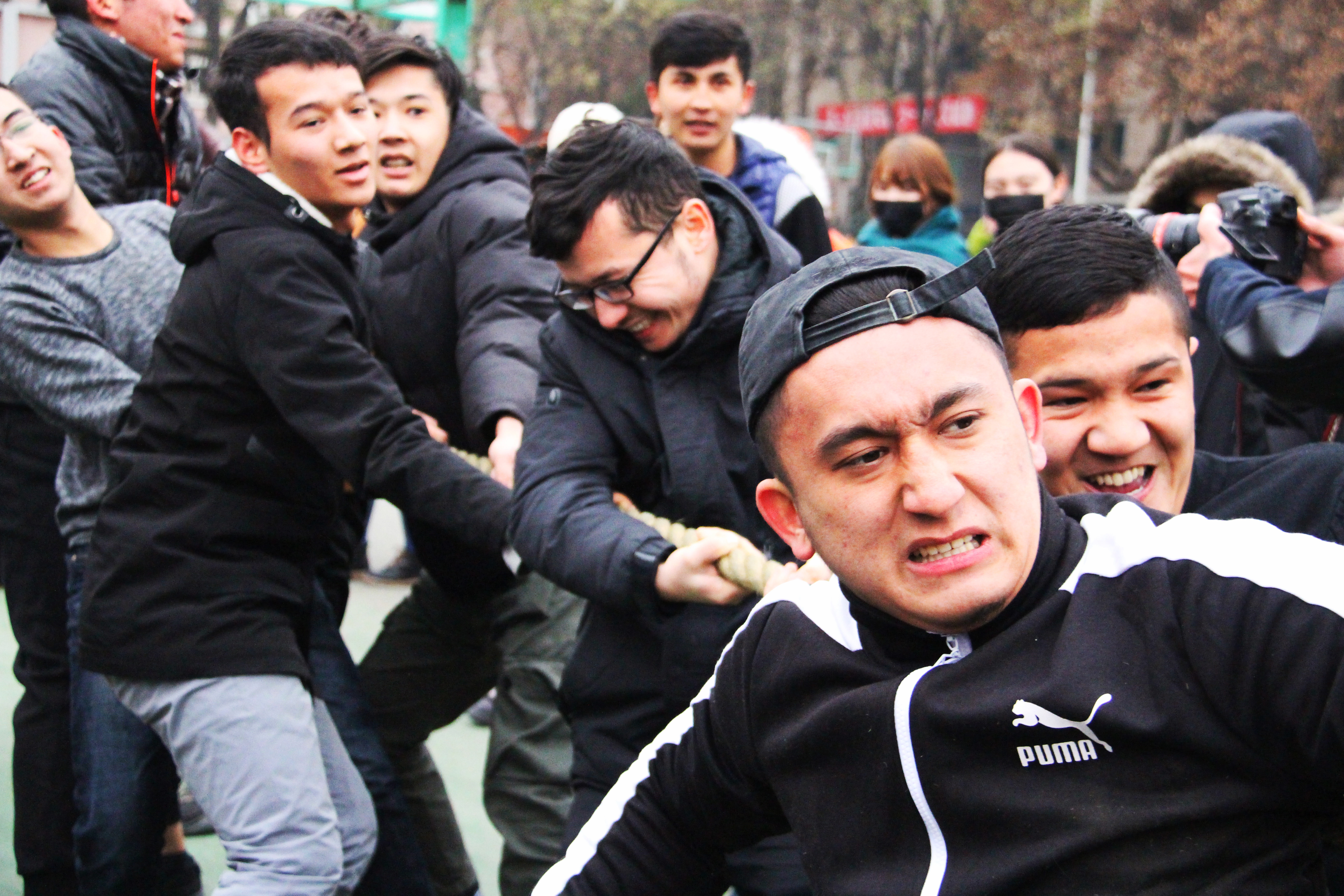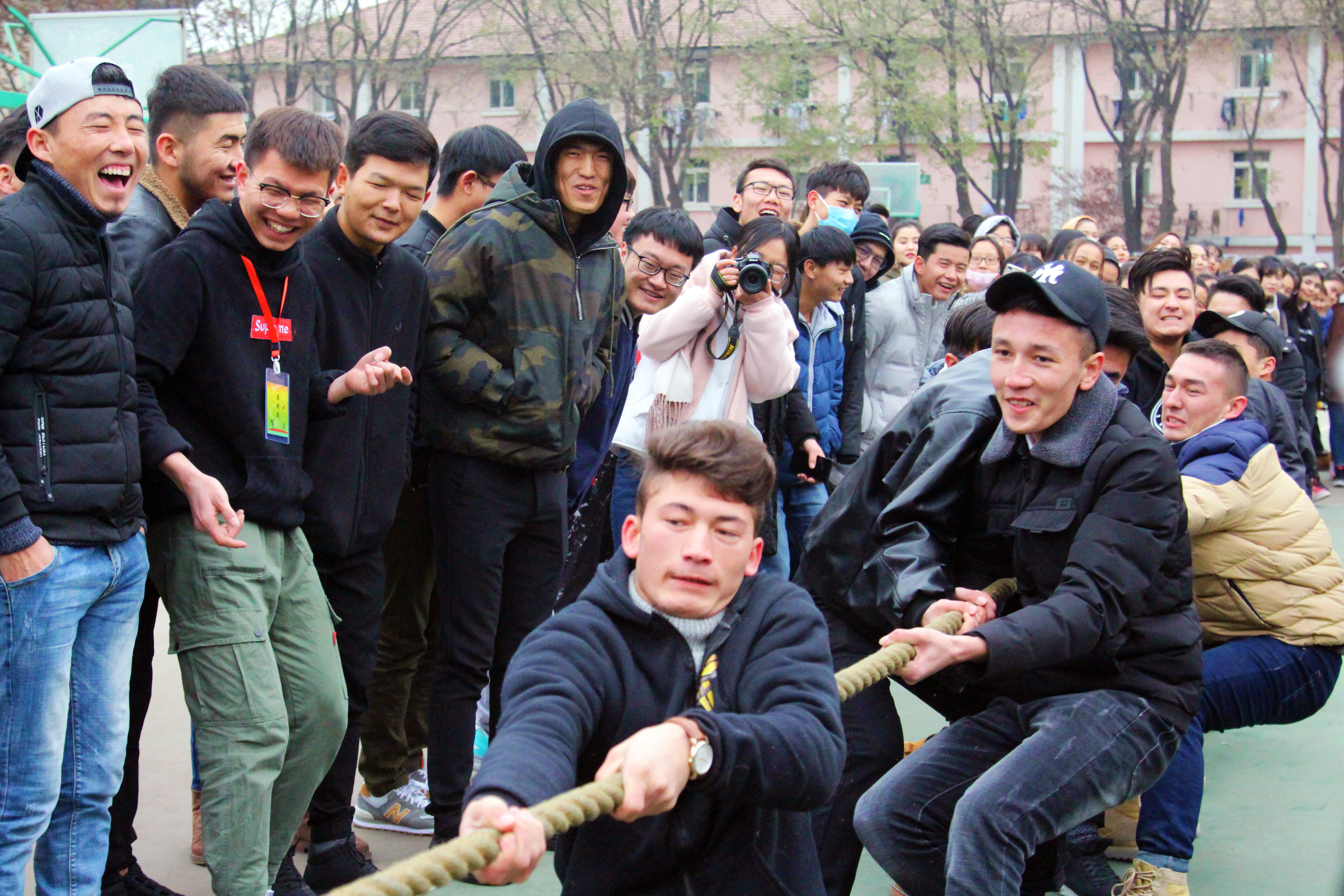 当比赛的哨声一响起,队员们口中一齐高呼着“一二,一二”,双手紧握长绳,憋足了劲拼命往后拉,在场观赛的同学们自发组成啦啦队为参赛人员加油。呐喊声此起彼伏,裁判们依据公平公正的原则,参赛人员本着" 友谊第一,比赛第二" 的原则,整场比赛进行有序,过程激烈却又饱含乐趣。经过激烈的耐力,体力较量,最终分别评出男、女生参赛队伍前三名。