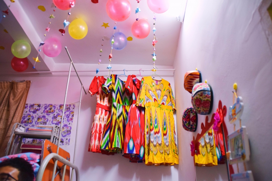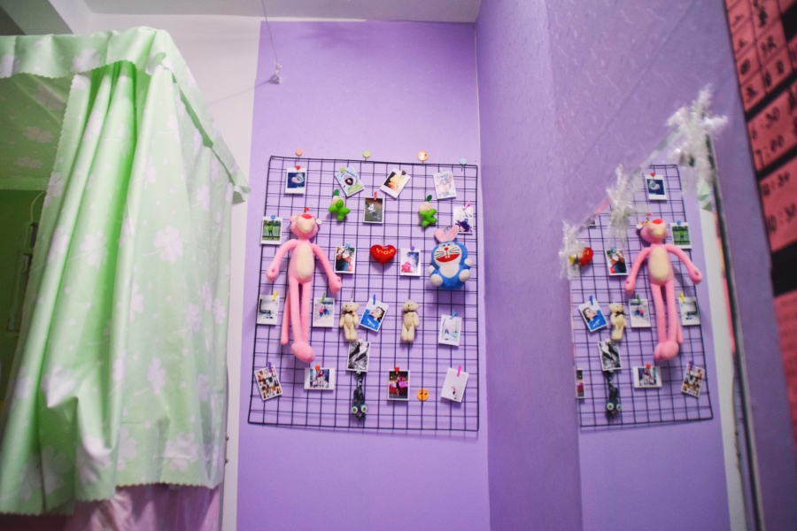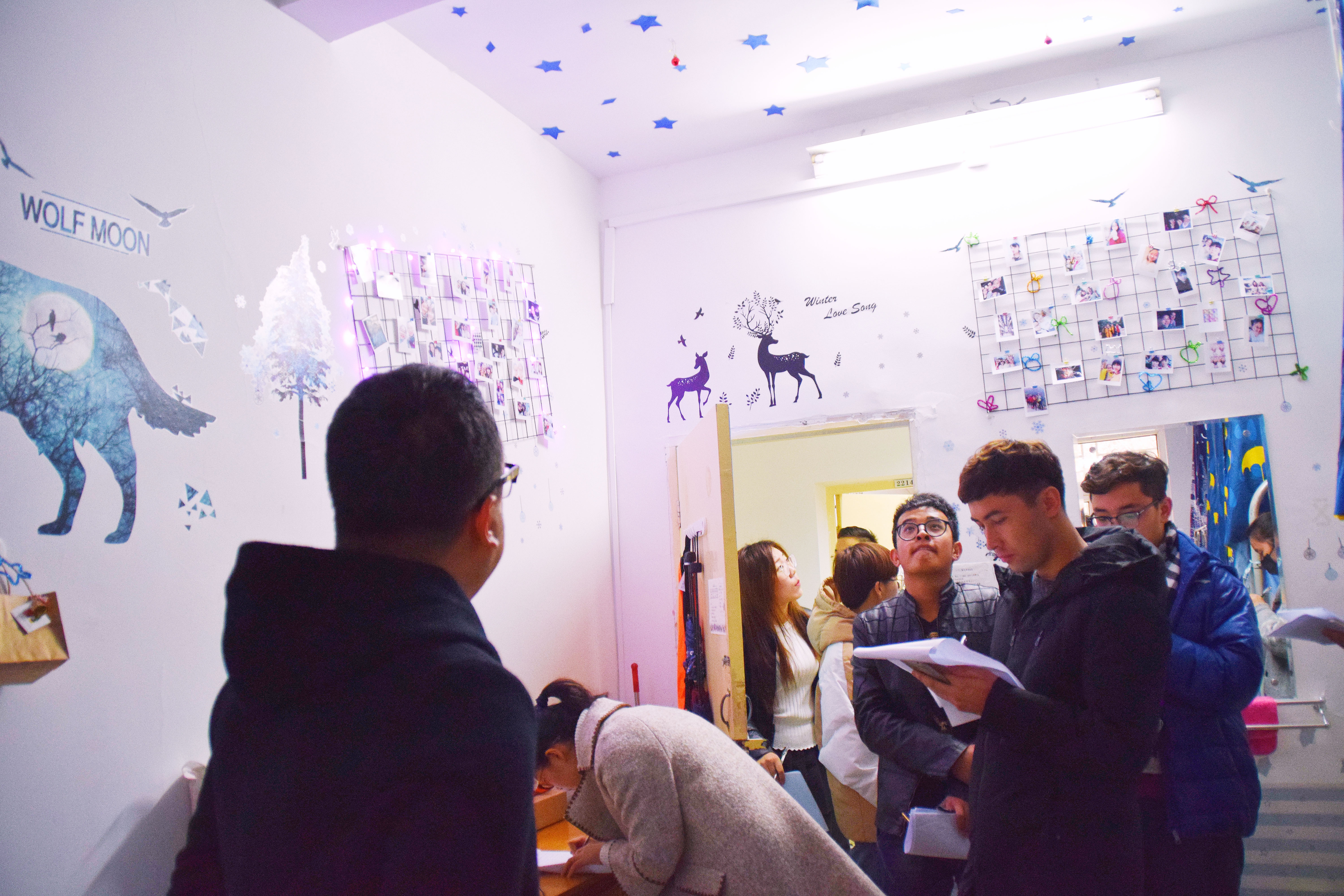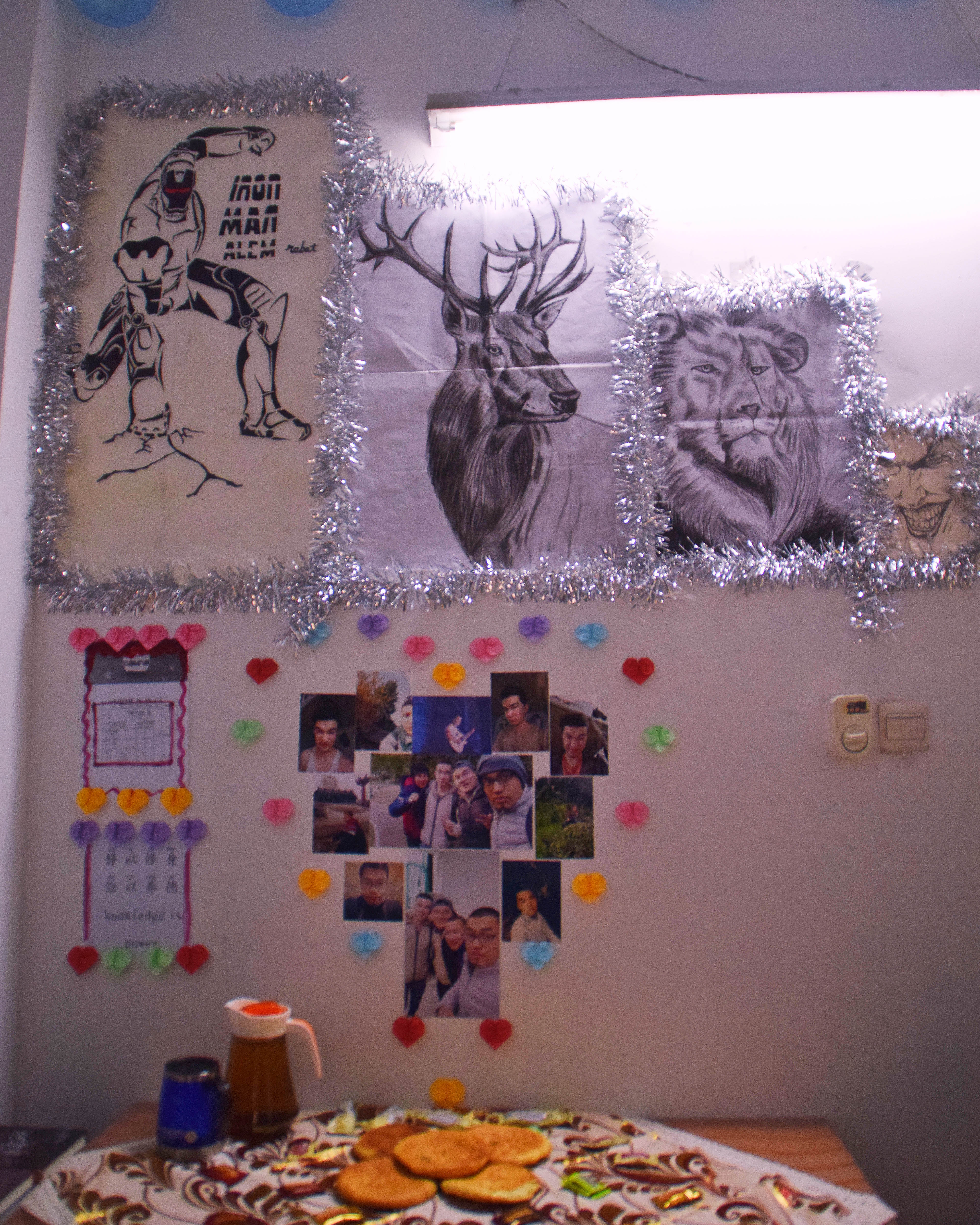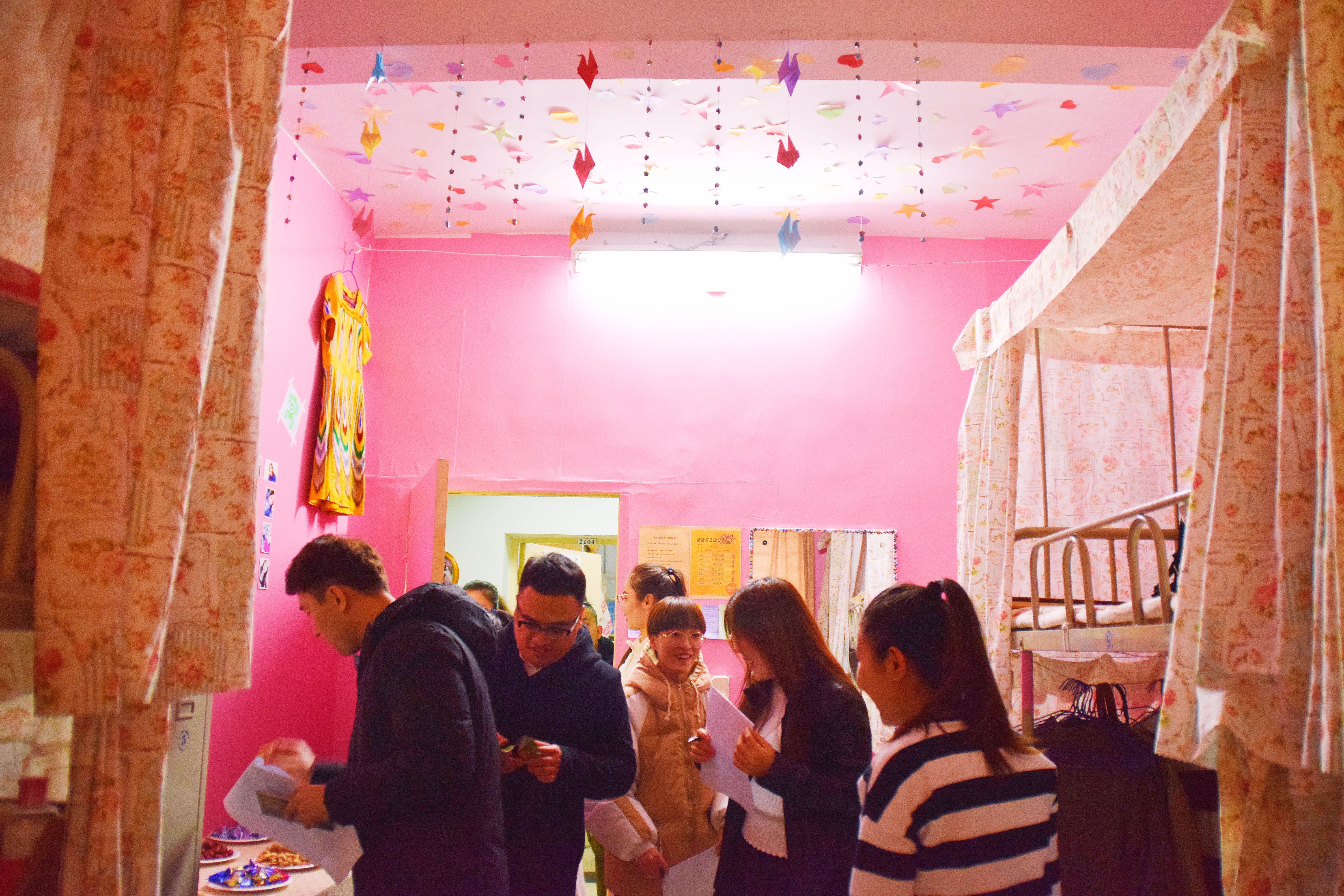 12月25日下午3点,宿舍文化节的评比活动正式开始。老师们及生活部干部先后走访参观了男生4-5号学生宿舍楼和2-3号女生宿舍楼。一进楼道,便能看见走廊上的相框里有学生们青春洋溢的笑脸,一望到小粉楼2栋三楼的走廊尽头,色彩艳丽的民族卡通画象扑入眼帘,那些别出心裁的宿舍主题风格和装扮创意更是令人眼前一亮,这些无一不显示出宿舍文化节浓厚的气氛。还有的宿舍墙上挂着的艾德莱斯绸,铺着民族风花纹桌布的桌子上摆放的馕,墙面上挂着的马头琴,都将民族文化融入生活之中。一些宿舍里挂着同学们手绘的人像画,精美的手工叠纸,得到了各位参审评委老师们的一致称赞。在参观过程中,老师们不仅对同学们参与宿舍文化节的热情表示肯定,同时对大家在宿舍评比中发现的问题提出了指导性的建议。