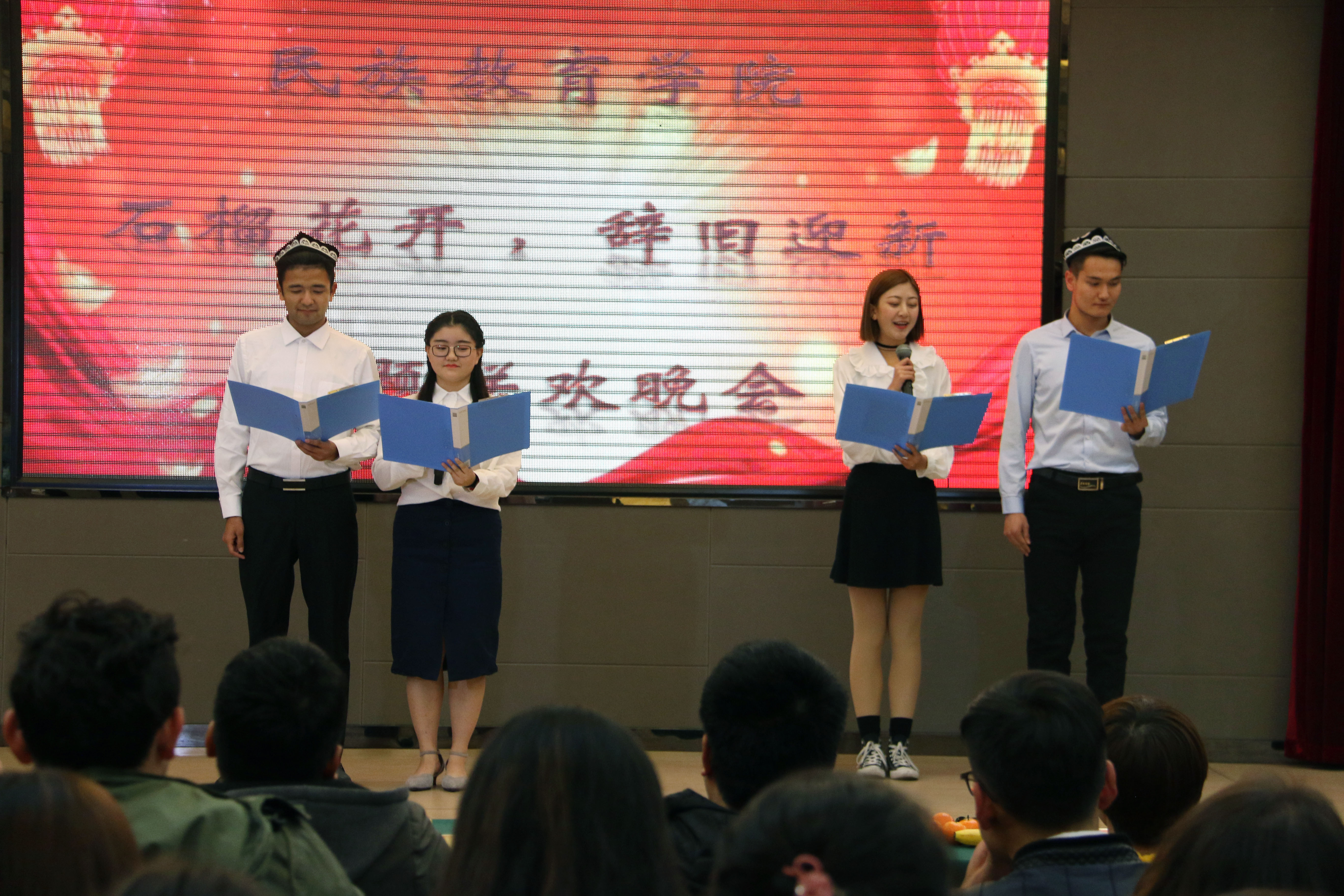 为迎接2017新生暨迎2018新年的到来,展现我院莘莘学子的风采。12月29日,由我院学生会主办,以“石榴花开,辞旧迎新”为主题的迎新晚会在我校雁塔区启夏苑二楼多功能厅拉开帷幕。我院党总支副书记、行政副院长窦文阳、团总支书记赵超、专职辅导员热依木、兼职导员张蕾高凤荣白玉雯共同出席了此次晚会。