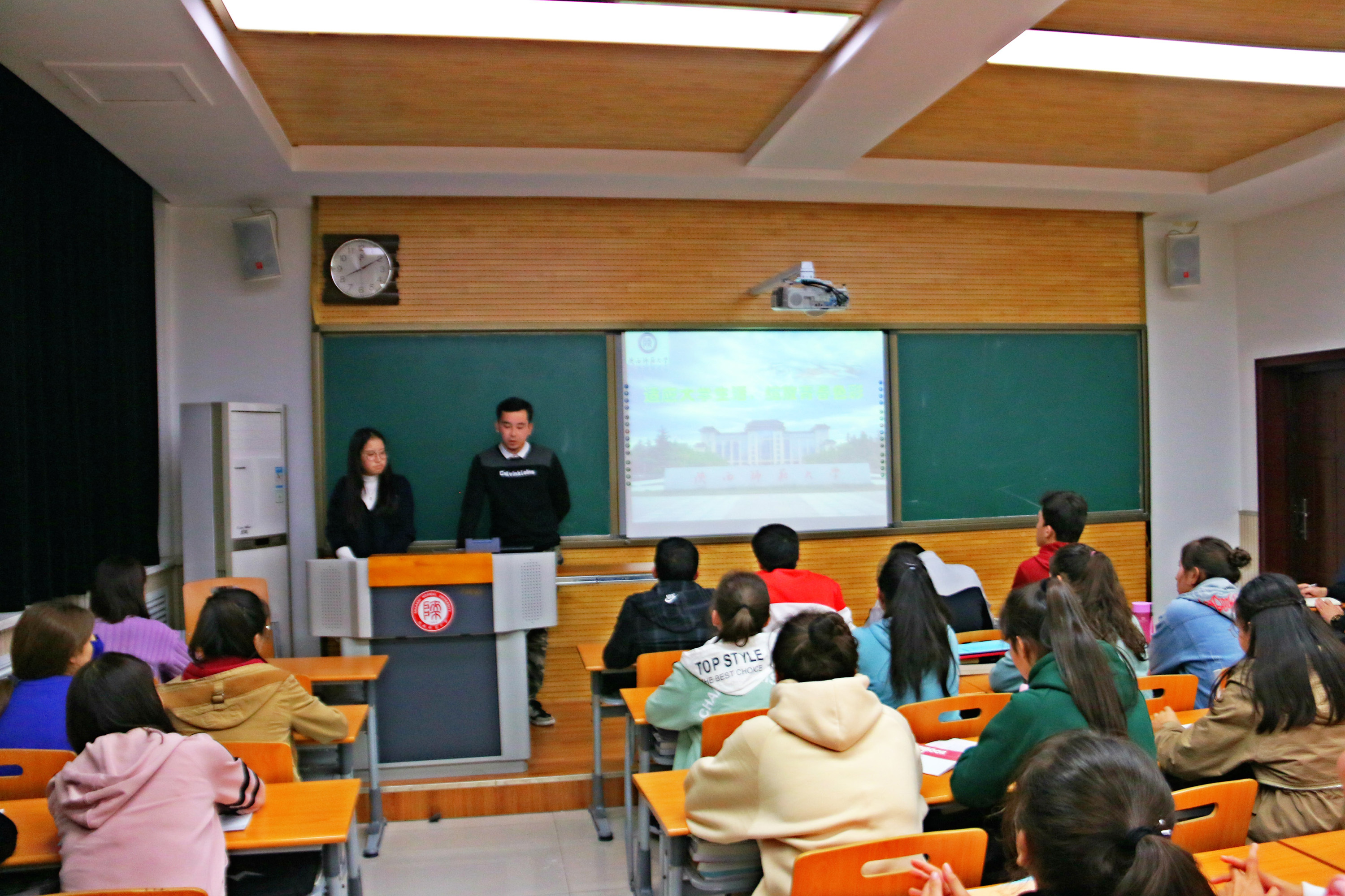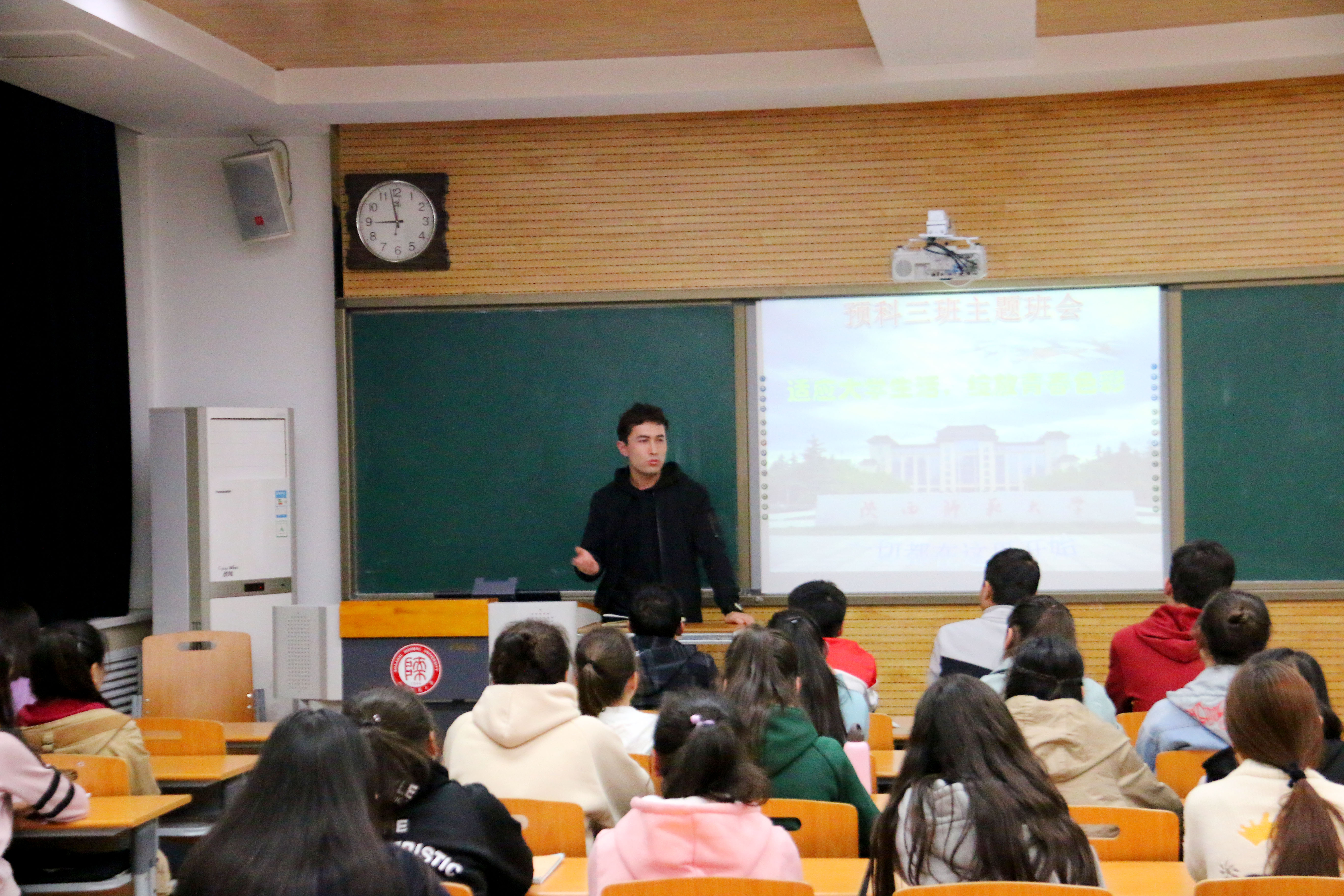 为了帮助同学们尽快适应大学生活,解决近期所遇到的烦恼、困惑和问题,促进同学之间的交流与发展,引导大家树立正确的生活学习观念,10月25日晚,我院2018级预科三班在九号楼9707教室召开了以“适应大学生活,绽放青春色彩"为主题的团日活动我院辅导员热依木老师及全班34名学生参加本次主题班会班会由班长艾利卡木和副班长什娜儿主持。