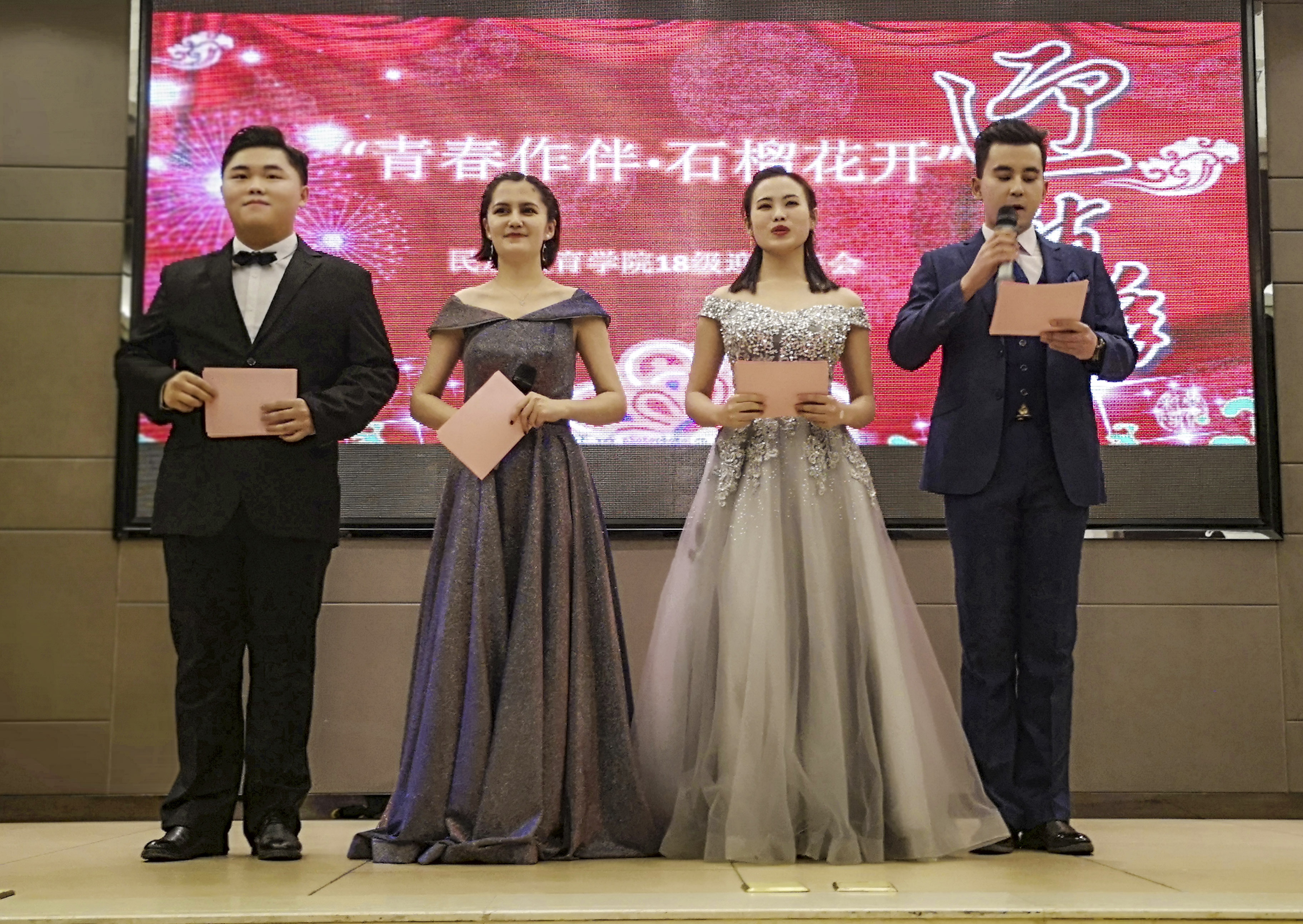 为迎接2018级新生暨迎2019新年的到来,展现我院莘莘学子的风采。12月21日19时,由我院学生会主办,以“青春作伴,石榴花开”为主题的迎新晚会在我校雁塔区启夏苑二楼多功能厅拉开帷幕。我院院长冯建新,副院长窦文阳,西安外国语大学辅导员哈斯铁尔,我院教师代表戴妍、唐涛、刘丁等各科老师,班主任乔露、谢欣然,专职辅导员热依木,兼职辅导员王国昌、许珊共同出席了此次晚会。
