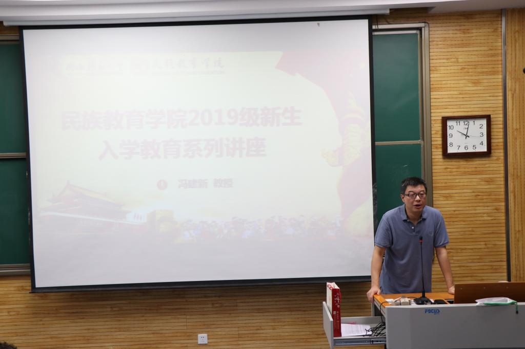 院长冯建新主讲,专职辅导员热依木主持,2019级全体预科新生参加讲座。