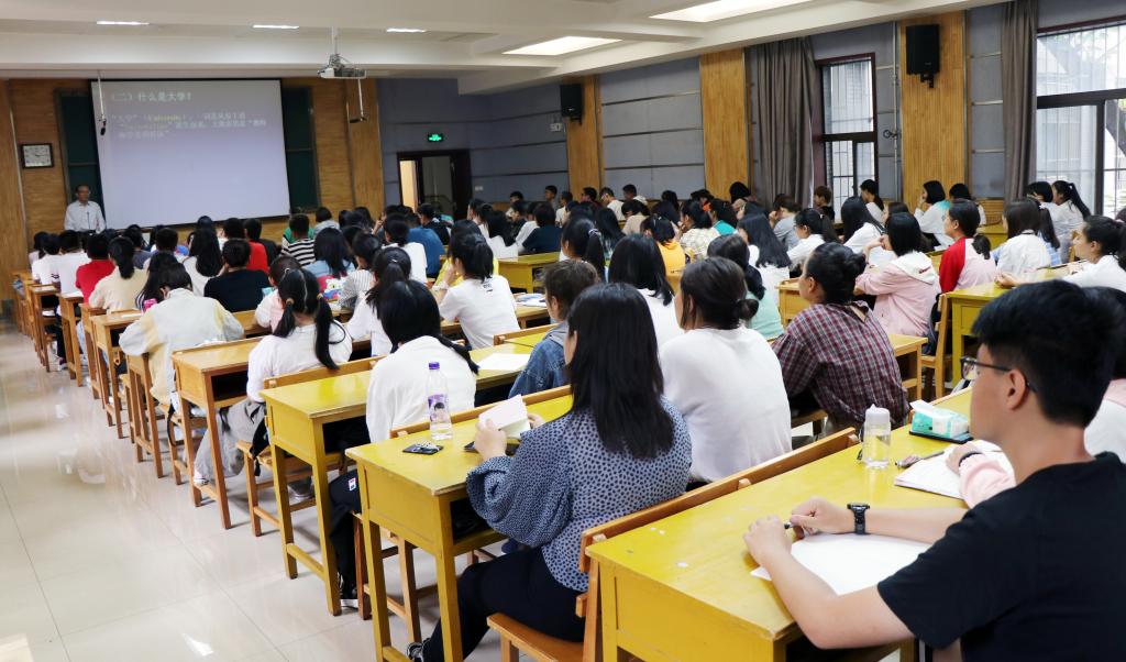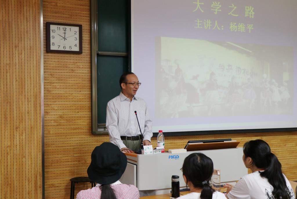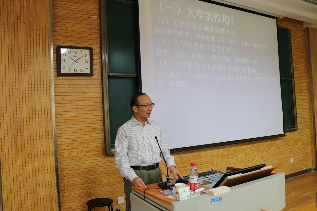 在介绍大学理念时,杨老师指出,大学是一种功能独特的文化机构,它既是教师和学者聚集地,也是培养人才与精英的象牙塔。大学的功能包括学习、继承、创造与实践,因而大学教育是人生的黄金阶段,是思想启蒙的重要环节,也是步入社会的过渡时期。为此,杨老师激励同学们要做“有理想、有文化、有道德、有纪律”的四有青年,做新时代下新要求下的优秀青年。在大学,更要转换依赖性为独立性,单打独斗为团队协作,学会合作精神,让自己的大学生活高效有序。