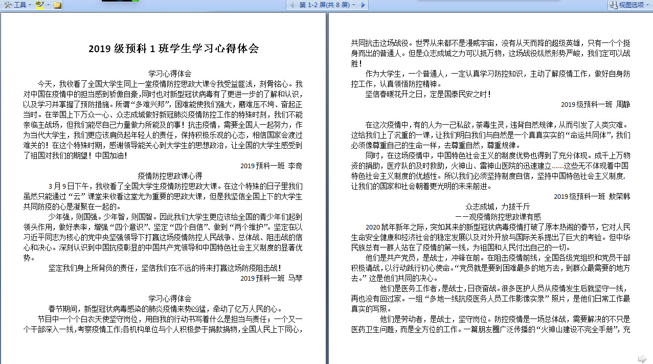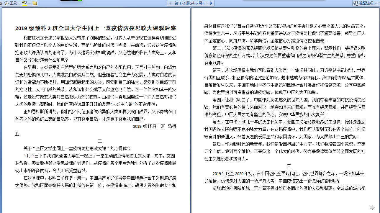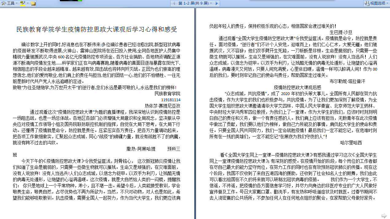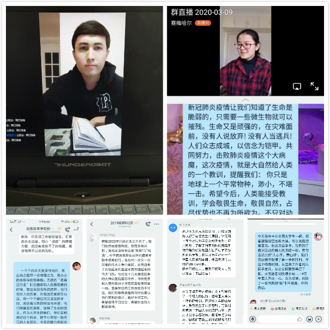 师生观看学习教育部“全国大学生同上一堂疫情防控思政大课”开展方案,于3月9日下午,认真组织预科学生通过人民网教育频道、人民网人民智云客户端、我校善思学堂、咪咕视频等客户端收看、收听,深入学习大课直播内容,即统计我院在线观看直播学习学生人数为33人,课后观看视频回放开展学习和参加讨论学生为100余人,收到学生心得体会与感想多篇,下午大课直播结束后学院专兼职辅导员以云班会形式与学生线上交流学习心得,分享个人感想和收获,深化对相关内容的认识,引导学生传承和弘扬爱国主义精神,培养社会责任感,深刻认识中国共产党领导和中国特色社会主义制度的显著优势,坚定“四个自信”,本次学习引起了我院学生热烈反响和强烈共鸣。