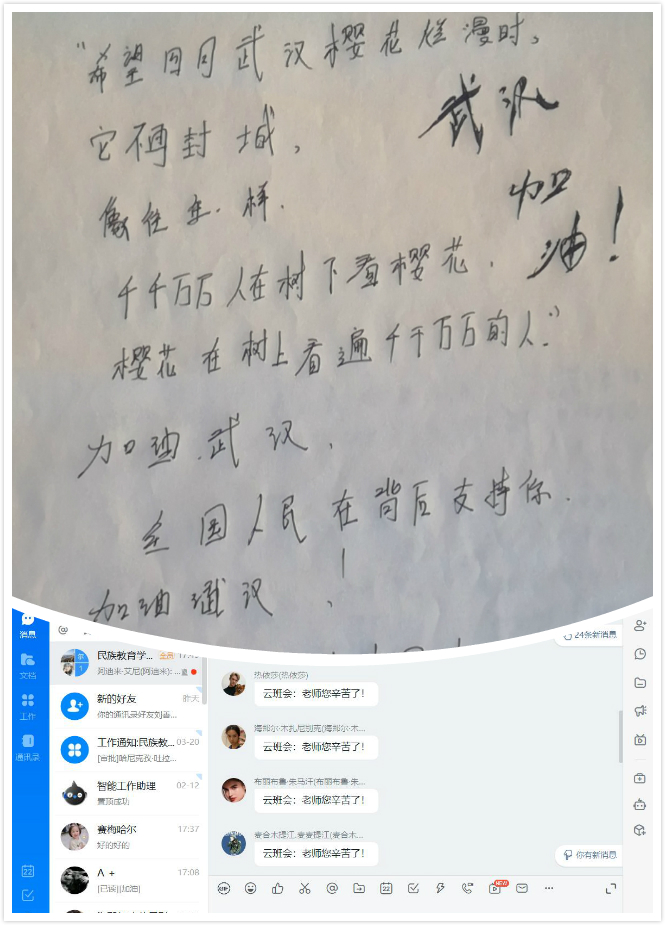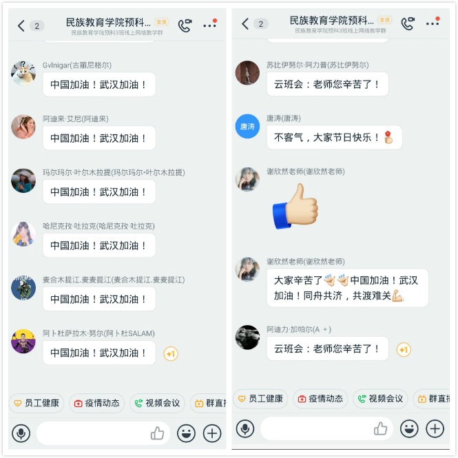 预科三班则以“‘秦’劳勇敢,守住来之不易的‘零’”作为云班会主题。班会上,首先通过视频的形式向同学们展示了抗击疫情过程中涌现出的感人事迹和敢于担当、取得突出成绩的正面典型,同时通过视频向同学们介绍了近期的疫情信息,让同学们对现阶段疫情的发展有了更深入的了解。随后,同学们与唐涛老师、卢静老师和谢欣然老师进行了热烈的师生互动,大家一起畅聊疫情期间生活状态,交流内心的感受和感思,班会最后,辅导员热依木老师做了班会总结。