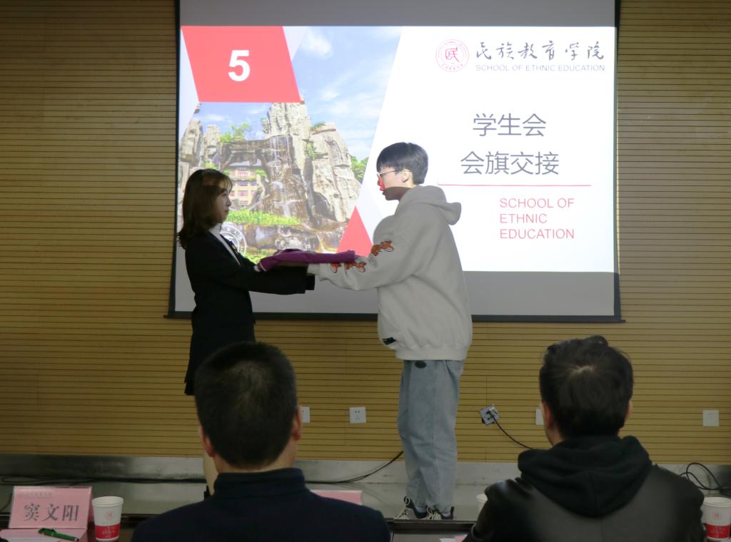 随后,我院2019级学生会主席马得胜与新一届学生会主席沈翰蒙举行了学生会会旗交接仪式。马得胜同学代表2019级学生会发言,总结了过去一年学生会的工作情况,分享了工作经验,表达了对学院的深厚感情,同时也对新一届学生会工作提出了展望。随后,新任学生会主席沈翰蒙同学发言阐述了自己对学生会、学生干部工作的认识和思考,并从打造一个团队:加强组织建设,树立团队形象、围绕一个中心:明确团队目标,开展学生服务、突出一个特色:挖掘学院特色,创建品牌活动、抓好一个重点:夯实业务基础,加大宣传力度等方面提出了新一届学生会的工作设想与规划。