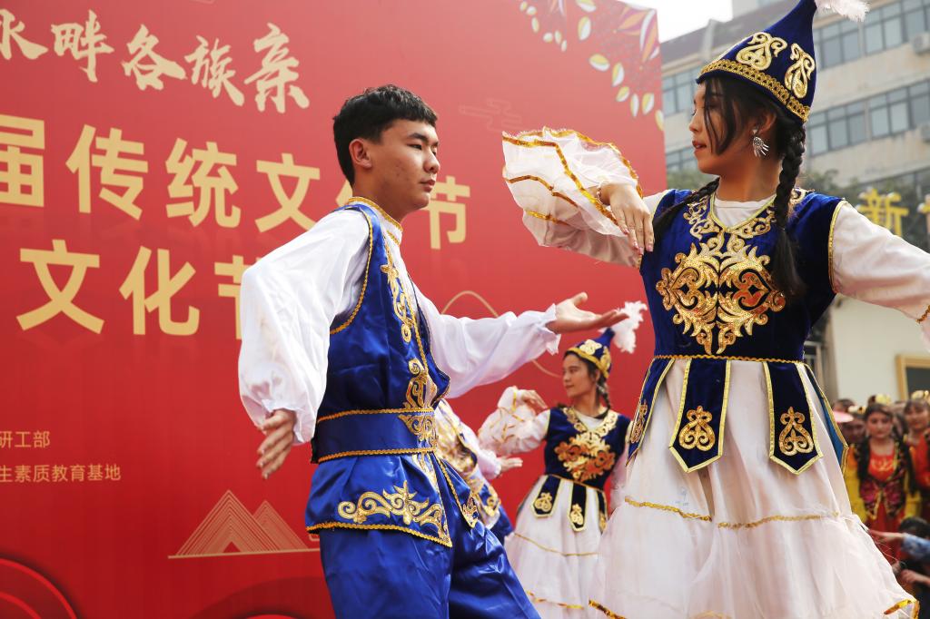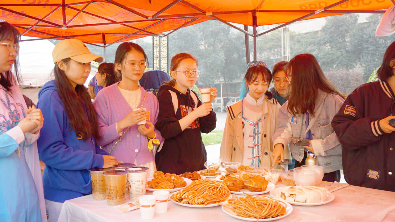 维吾尔族的美食极具特色,其中抓饭、烤肉、烤包子等受到了广大师生的欢迎。新疆特色葡萄干、红枣堆等干果叠于盘中。香脆可口的馕饼上用芝麻拼成“民族团结一家亲”的字样。舞蹈艺术也同样特点鲜明,奔放而富有激情的传统民族舞、刀郎舞、萨玛舞展现了维吾尔族舞蹈文化的独特魅力。哈萨克族同学将草原上的毡房搬进校园,毡房内陈列着民族工艺品与展示民族风情的图片,走进毡房,便可了解到哈萨克族的风土人情,毡房里身穿民族服饰的哈萨克族同学,也在为观众讲解哈萨克族的传统文化与风俗习惯。
