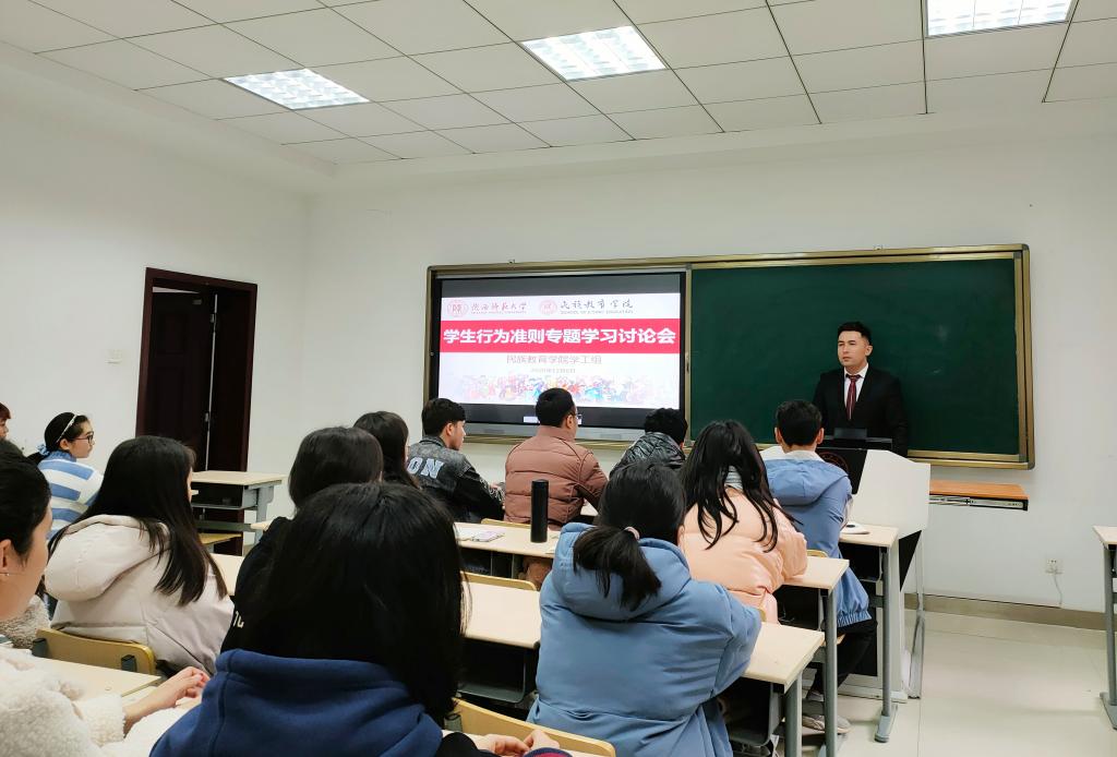 本次学习主要由各班专兼职辅导员对准则内容进行解读,阐明学习准则的重要意义、引导同学认识遵守学生行为准则的重要性三个方面展开。一班兼职辅导员王雅丽老师通过引入大量例证,从身边具体问题着手,与同学交流日常行为对生活造成的影响,引发同学的思考,强调大学生遵守《学生行为准则》的重要性。二班兼职辅导员张雨老师通过播放教育短片强调了尊重与理解、包容与沟通在同学们生活中的必要性,提出新时代大学生应该从当下做起,注重行为规范,有意识提升自我思想品德,使自己成为更具青春活力、更有道德修养、更加文明有礼,养成良好的生活习惯。三班辅导员热依木老师从个人、学校、社会三大层面引导同学们遵守学生行为准则的重要性和必要性,并让同学们围绕校园日常生活来进行相关探讨,紧贴日常校园生活实际,深挖问题本质,让同学们切实理解《学生行为准则》的内在含义和深刻意义。