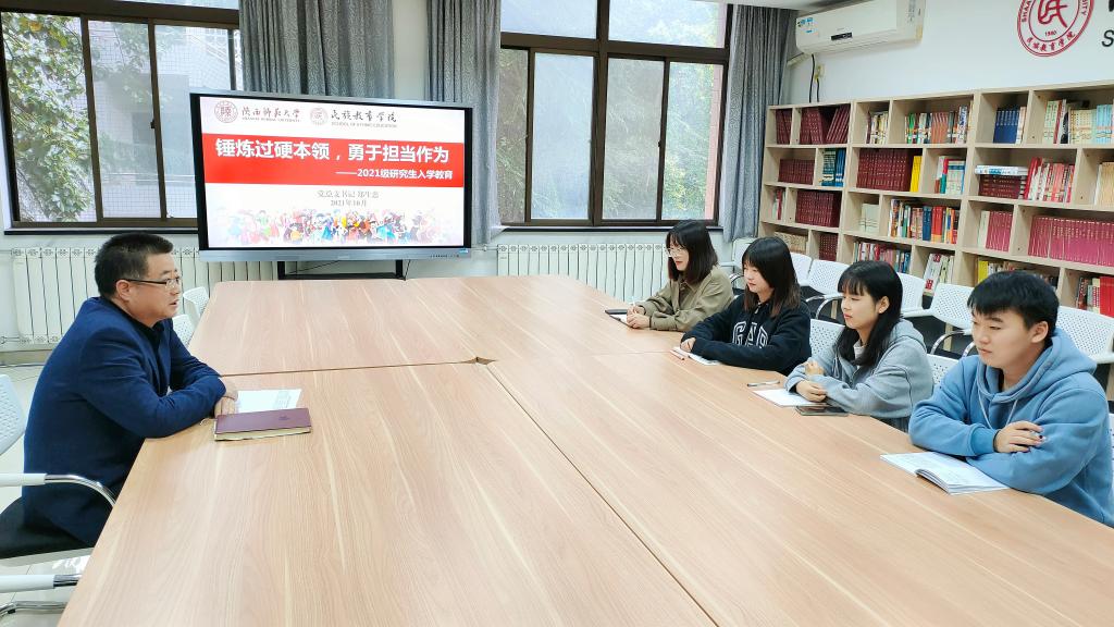 为了帮助2021级研究生新生尽快适应在校学习和生活,明确学习目的,科学规划学业生涯,顺利开展研究生学习和科研工作,10月9日下午3点在六附楼305会议室,学院党总支书记郑生忠为2021级研究生新生作了以“锤炼过硬本领、勇于担当作为”为主题的新生入学教育。希望通过入学教育,引导学生端正思想、调整心态、找准定位,以昂扬的精神状态迎接崭新的研究生生活,以更积极的心态投入到紧张而又充实的学习中。