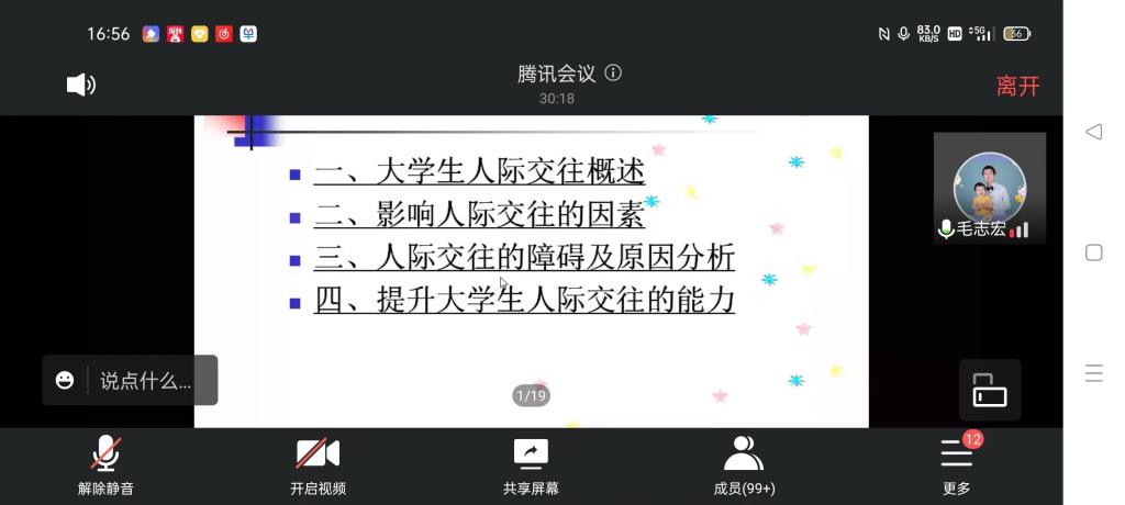于5月18日下午4:30开展了以“培育阳光心态、护航青春成长”为主题的心理健康教育专题讲座,学校心理健康教育(咨询)指导中心副教授、中国心理学会注册系统注册咨询师、国家二级心理咨询师毛志宏作了题为“让心的距离更近—大学生人际交往能力的提升”的主题心理育人专题讲座。学院团总支书记热依木·努尔麦麦提,专职辅导员王霞、兼职辅导员谢成玉、夏逸静以及全体学生通过腾讯会议平台收看了讲座直播。