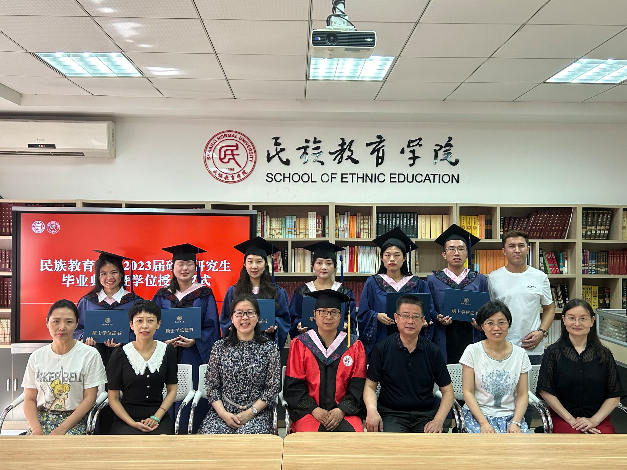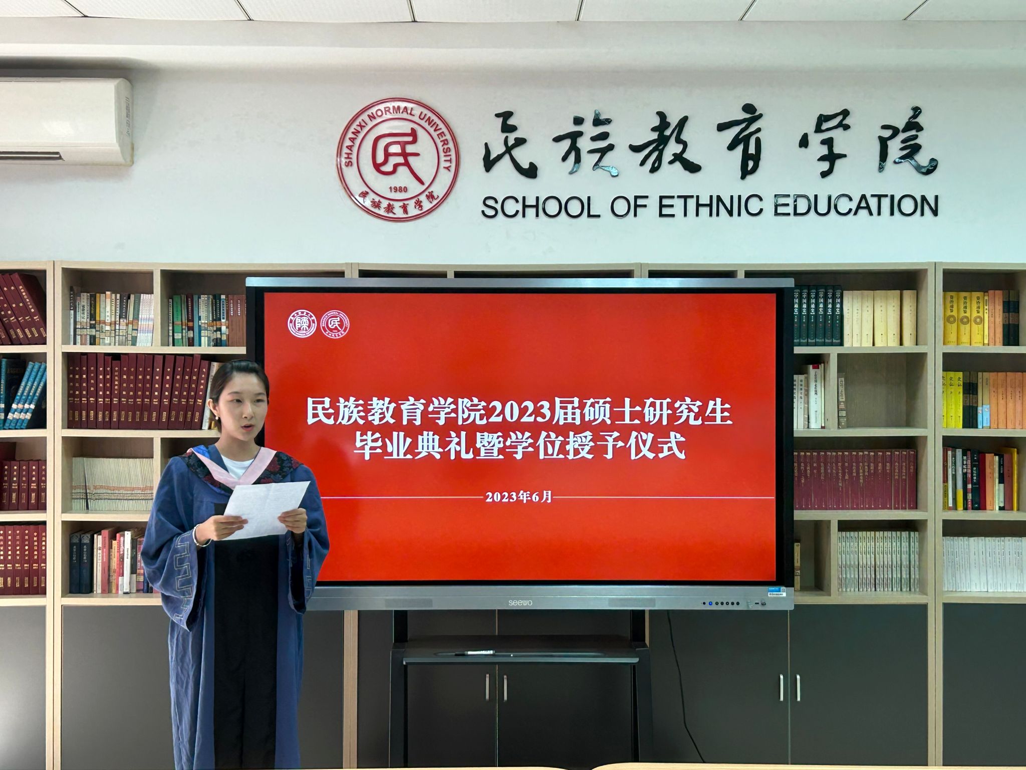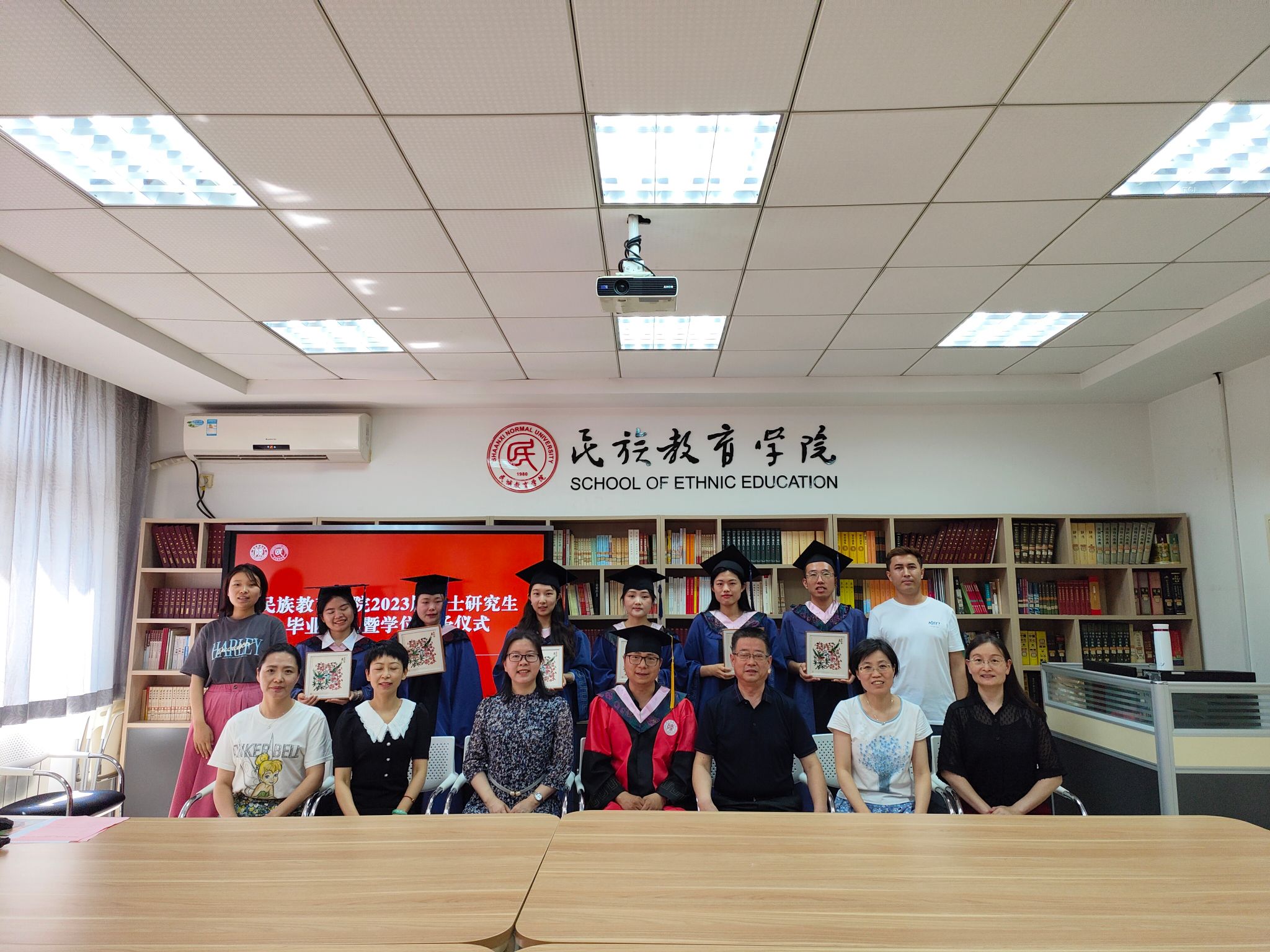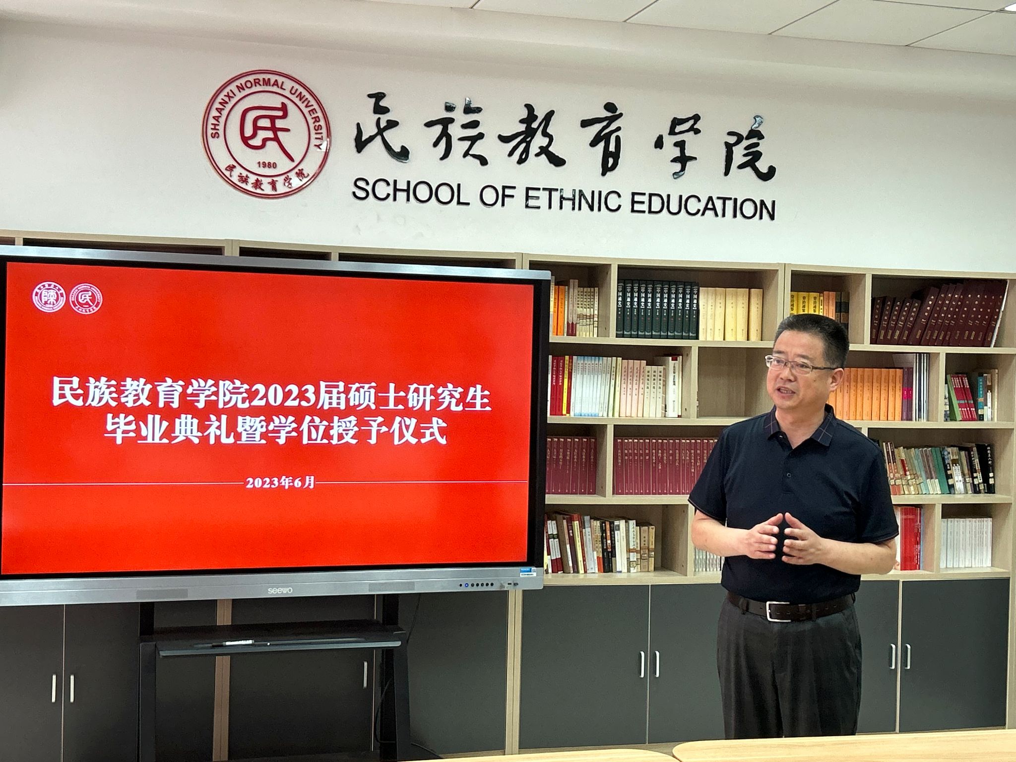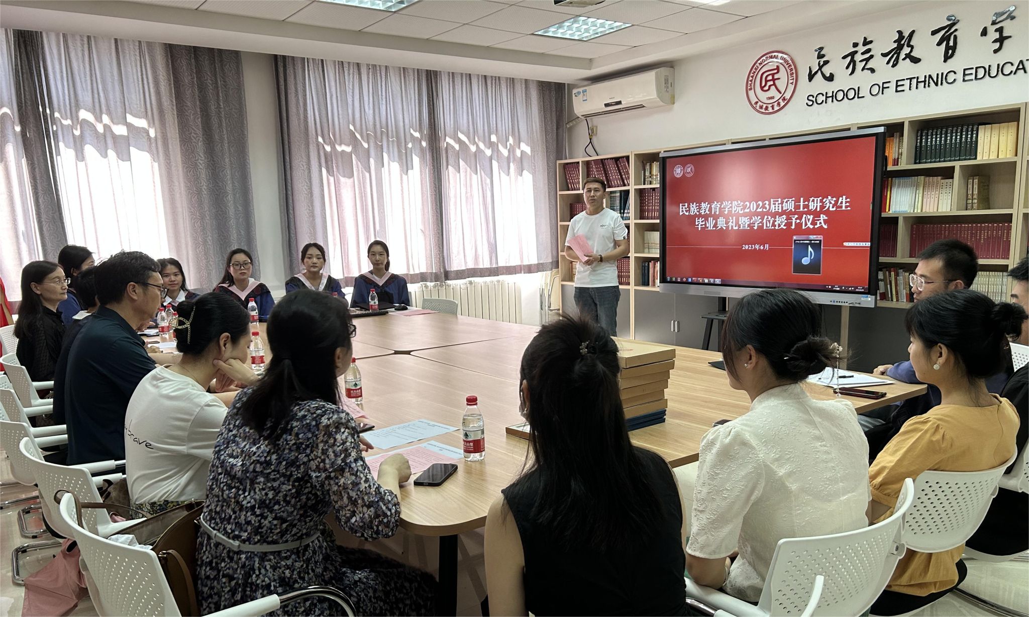 民族教育学院2023届硕士研究生毕业典礼暨学位授予仪式在雁塔校区六附楼305会议室举行。学院党总支书记郑生忠、学术委员会主任、院长、党总支副书记龙宝新、学术委员会副主任戴妍及毕业生导师代表卢静、成珊娜、萨仁娜出席了本次典礼。毕业典礼由学院党总支组织员、团总支书记、研究生专职辅导员热依木·努尔麦麦提主持,学院2023届毕业研究生和2021级研究生到场参加。