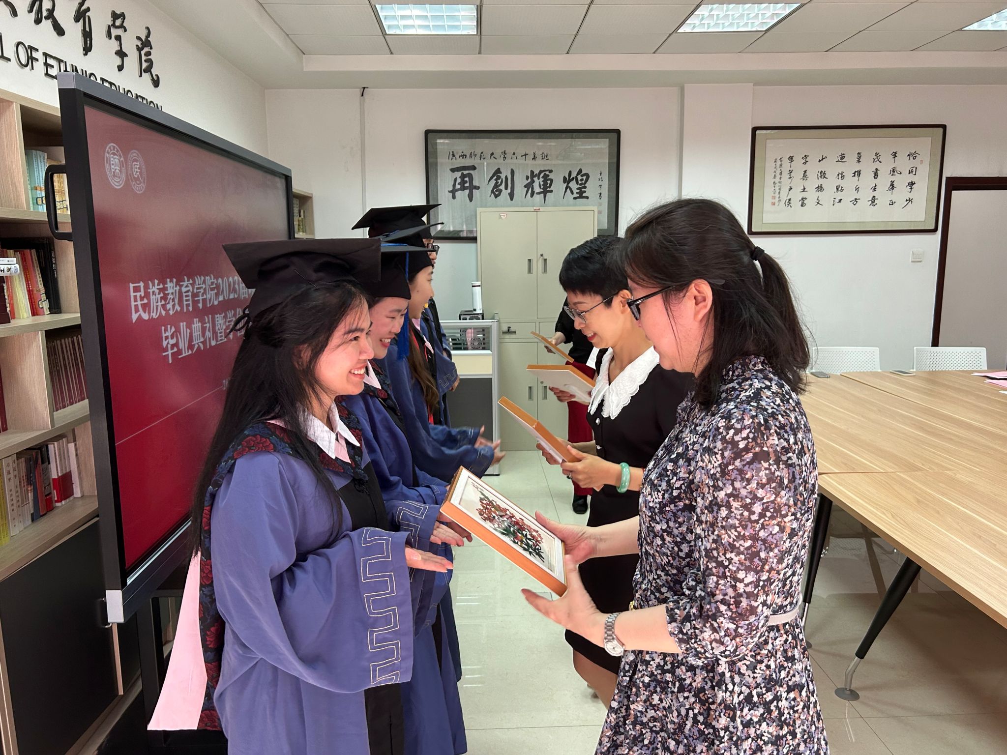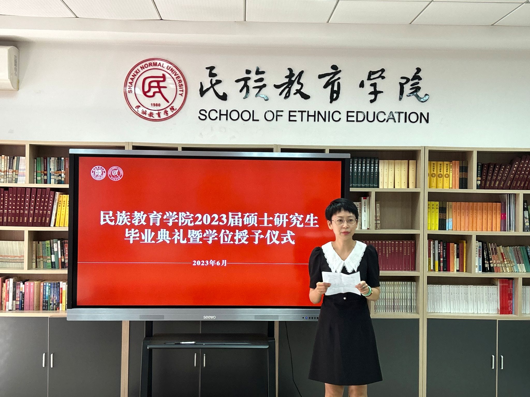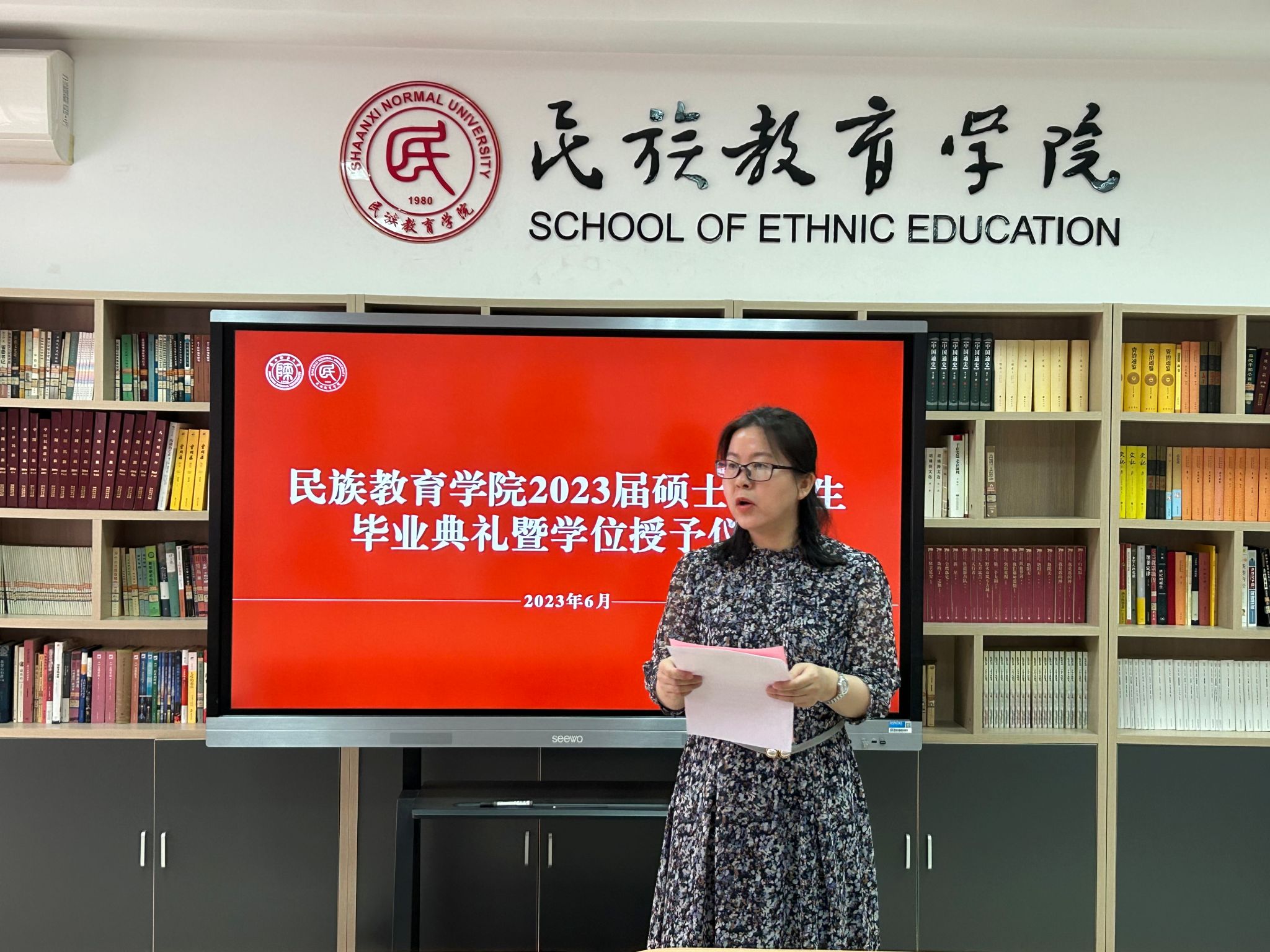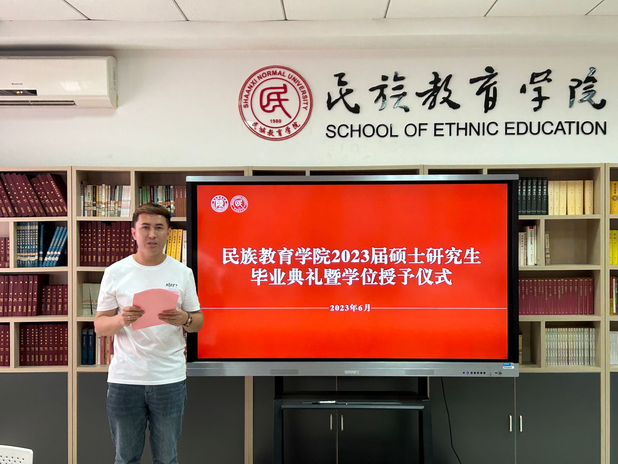 民族教育学院2023届硕士研究生毕业典礼暨学位授予仪式在雁塔校区六附楼305会议室举行。学院党总支书记郑生忠、学术委员会主任、院长、党总支副书记龙宝新、学术委员会副主任戴妍及毕业生导师代表卢静、成珊娜、萨仁娜出席了本次典礼。毕业典礼由学院党总支组织员、团总支书记、研究生专职辅导员热依木·努尔麦麦提主持,学院2023届毕业研究生和2021级研究生到场参加。