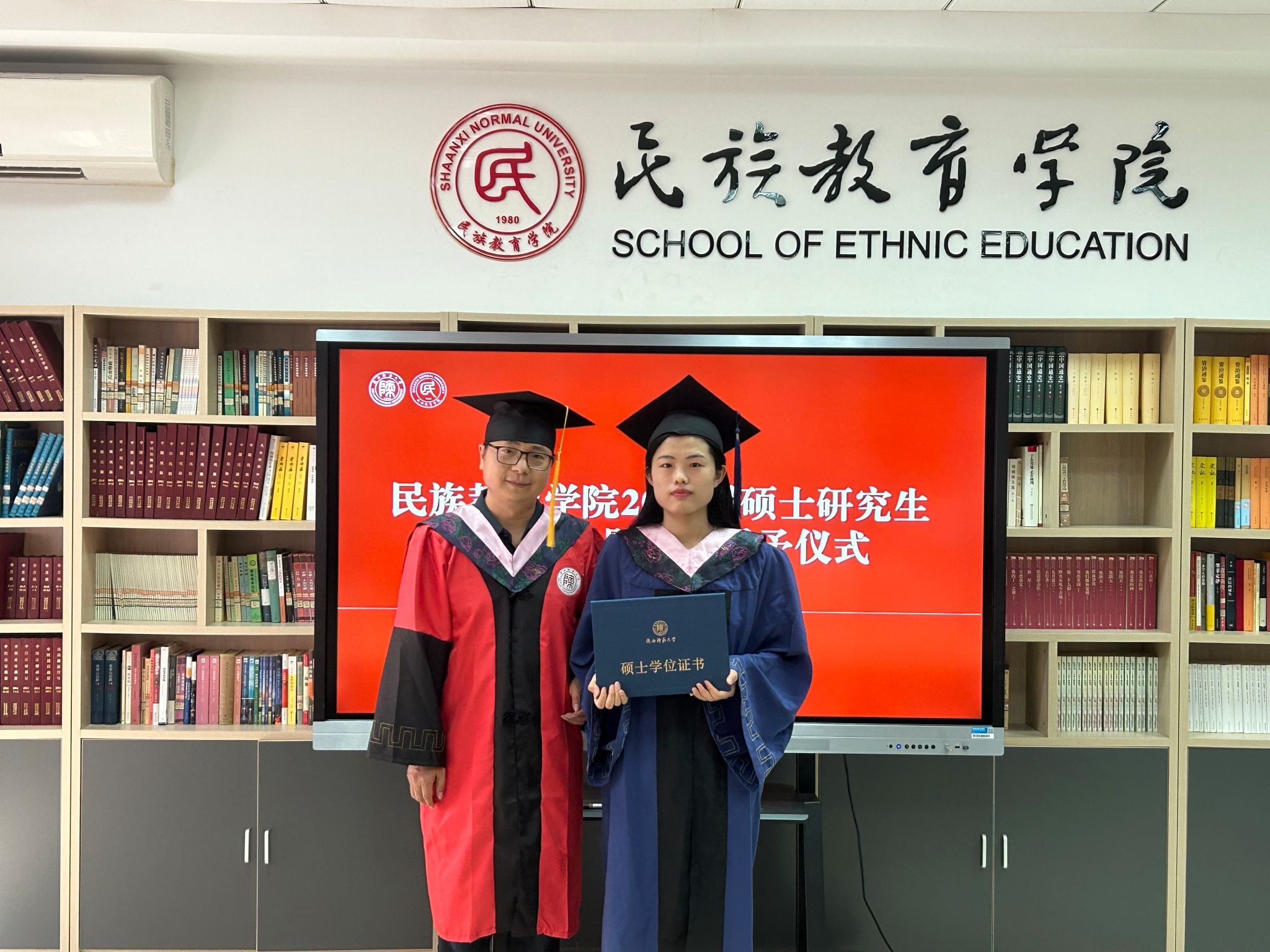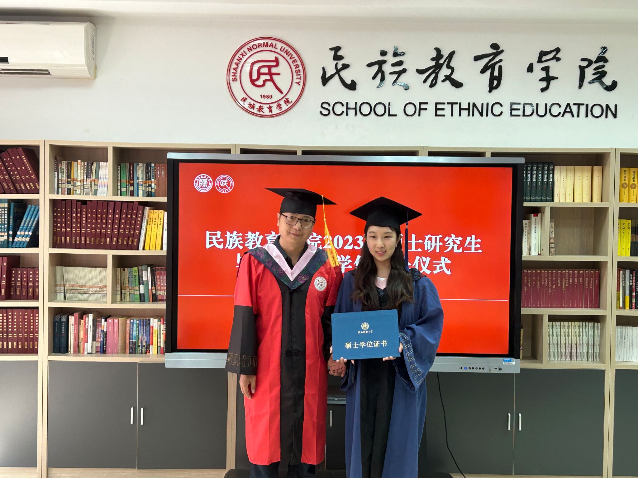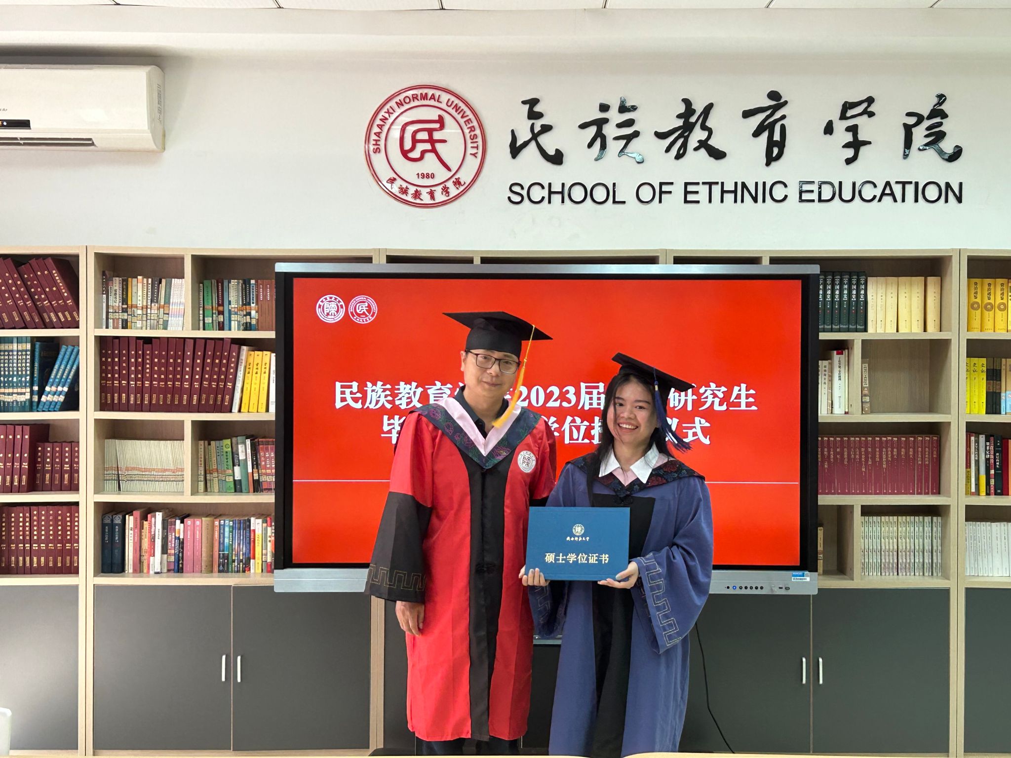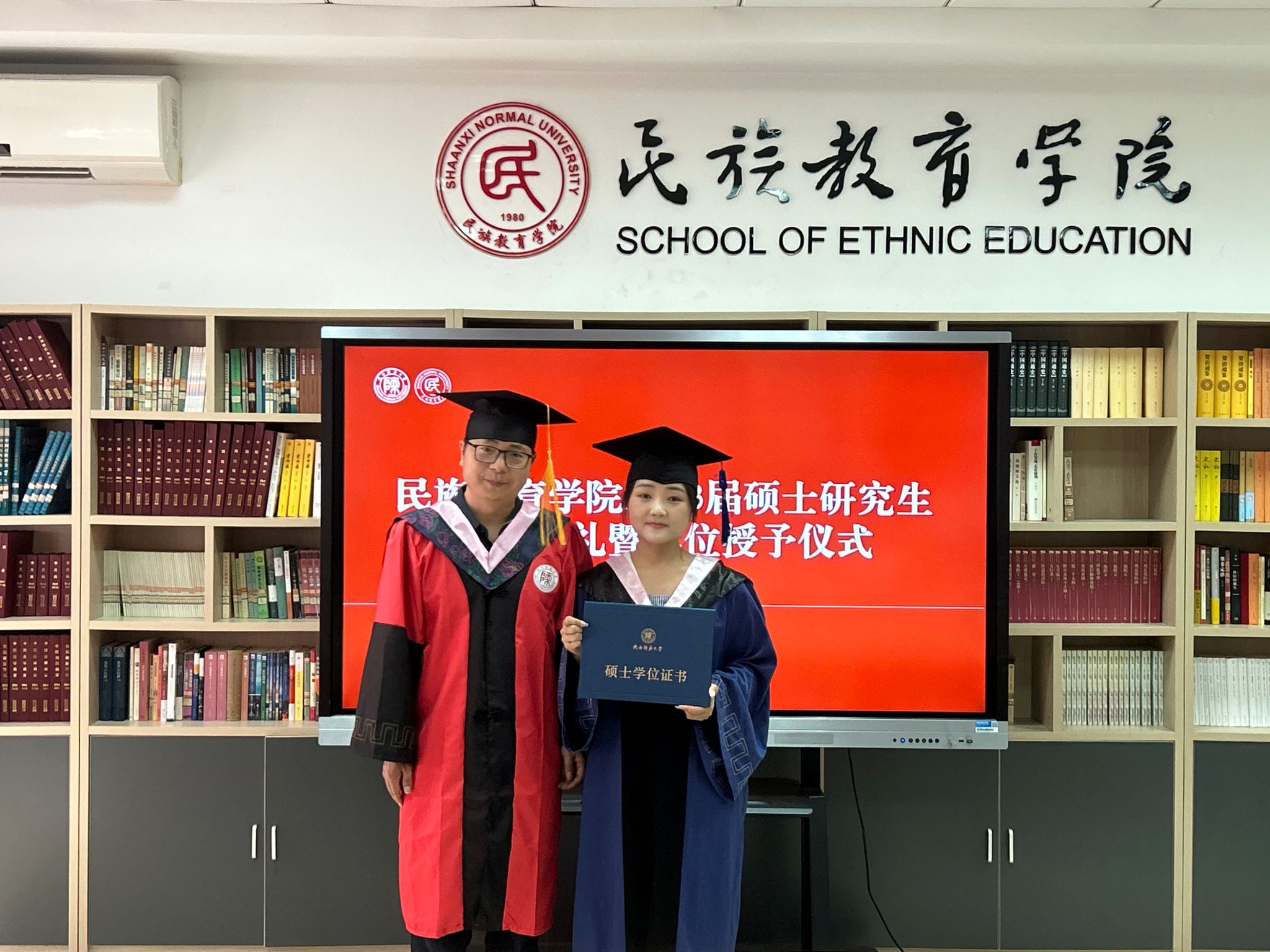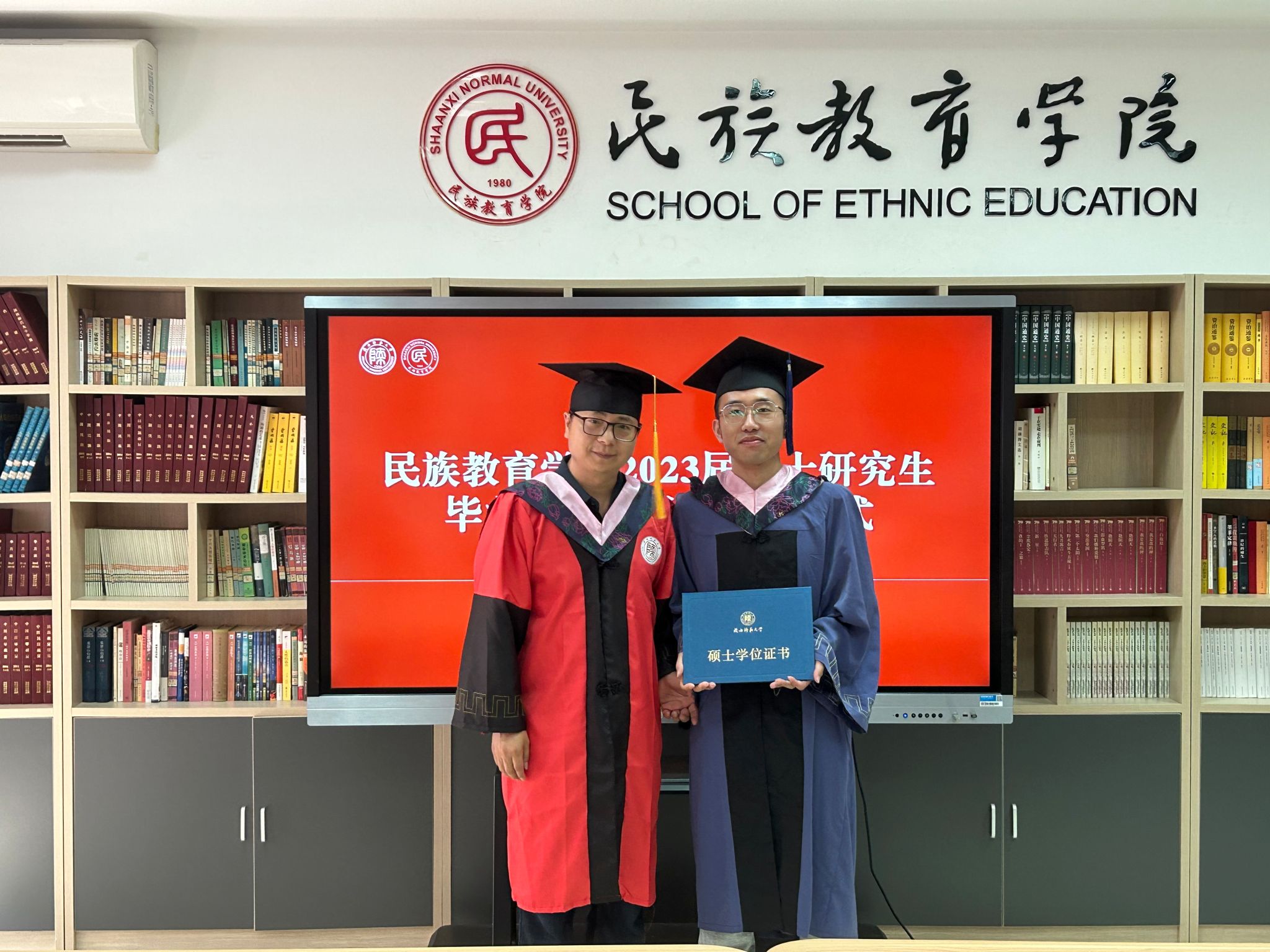 民族教育学院2023届硕士研究生毕业典礼暨学位授予仪式在雁塔校区六附楼305会议室举行。学院党总支书记郑生忠、学术委员会主任、院长、党总支副书记龙宝新、学术委员会副主任戴妍及毕业生导师代表卢静、成珊娜、萨仁娜出席了本次典礼。毕业典礼由学院党总支组织员、团总支书记、研究生专职辅导员热依木·努尔麦麦提主持,学院2023届毕业研究生和2021级研究生到场参加。