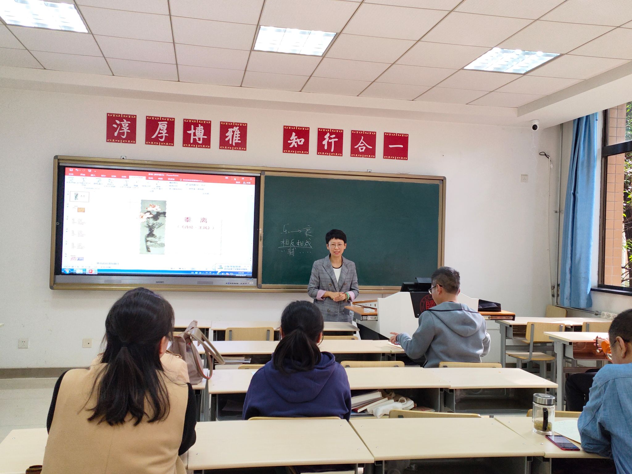 此次教学示范课由卢静老师执教,选取《诗经·王风》中的《黍离》为授课内容。卢静老师以诗歌诵读导入课程,使学生身临其境的感受到诗歌所表达的情感,激发学生学习的积极性。在授课过程中,卢静老师着重于诗歌的艺术特色进行讲解,课程内容重点突出,旁征博引,课堂讲授与启发思考相结合、教学目标与思政目标相结合,呈现完整课堂教学结构,课堂效果甚佳。