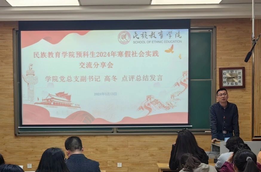 在教学五楼5301教室举行“寒假实践展民院风采,互学互鉴促青春成长—预科生2024年寒假社会实践交流分享会”。学院党总支书记郑生忠、院长龙宝新、党总支副书记高冬、学校派驻教师祖丽菲亚、教师代表乔露、团委书记专职辅导员热依木、兼职辅导员李雪儿,以及全体预科生参加此次交流分享会。