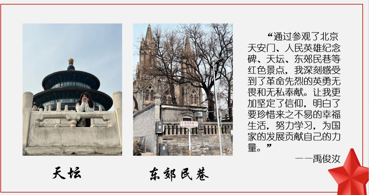 红色遗迹是历史的见证,是党和国家的宝贵财富。学院学子们踏上红色之旅,亲身感受中国共产党人那段筚路蓝缕、波澜壮阔的革命历程。红烛探索小组的同学们不畏艰难,追寻着革命先烈的足迹,在志愿服务、红色教育、社区服务和公益活动等领域留下身影。同时,他们走访各地的红色地标,仿佛穿越时光,与先辈们进行了一场深刻的对话。通过学习革命文化,汲取精神力量,强化民族团结意识,以实际行动传承红色基因,赓续革命精神。