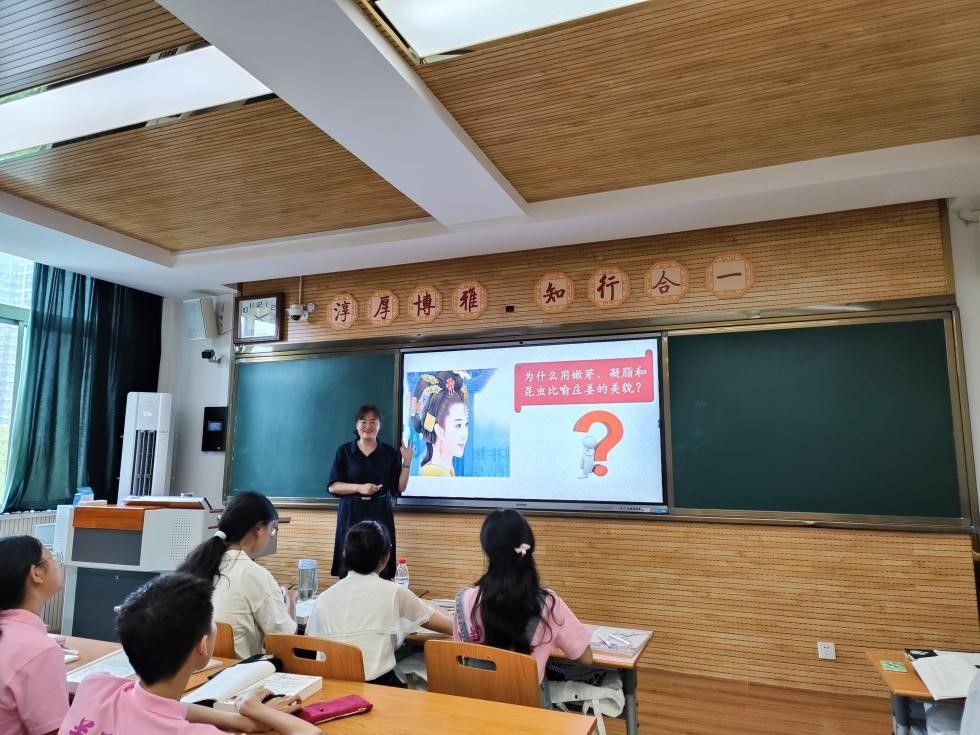 活动中,教师们首先观摩了王羽红老师的教学过程,王老师的授课内容为《诗经》,她以“《诗经》由何而来”这一问题导入,引发同学们积极思考和回答,进而讲到《诗经》在当时的广泛应用和“六义”之说,指出书中不少成语流传至今,可见其影响力。接下来,重点分析讲解了《硕人》篇的诗篇内容、表现手法。在授课过程中,王老师讲述层次清晰,注重通过经典的诵读,帮助学生领悟文本内涵和艺术魅力。课堂上师生问答活跃,互动性强,取得了良好的课堂效果。