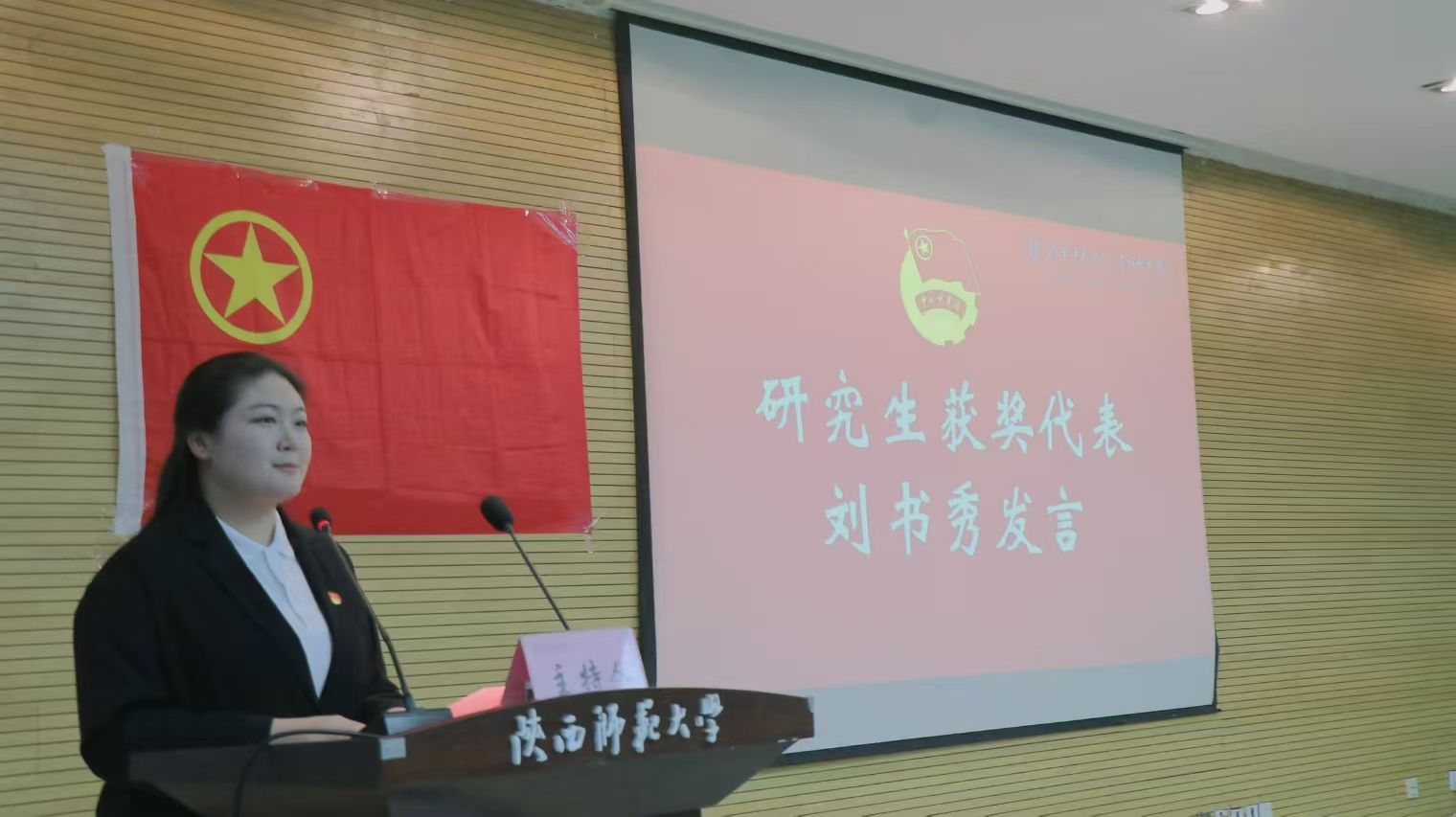 随后,研究生获奖代表刘书秀同学发言,她为同学们分享了自己宝贵的学习生活经验。她表示,自己的每一份成就都离不开学院各领导和老师的辛勤栽培与悉心指导。她鼓励同学们要在学习的海洋中奋楫扬帆,在困难面前破浪笃行,以积极向上的态度去努力奋斗,用赤诚丹心谱写新时代的青春之歌。
