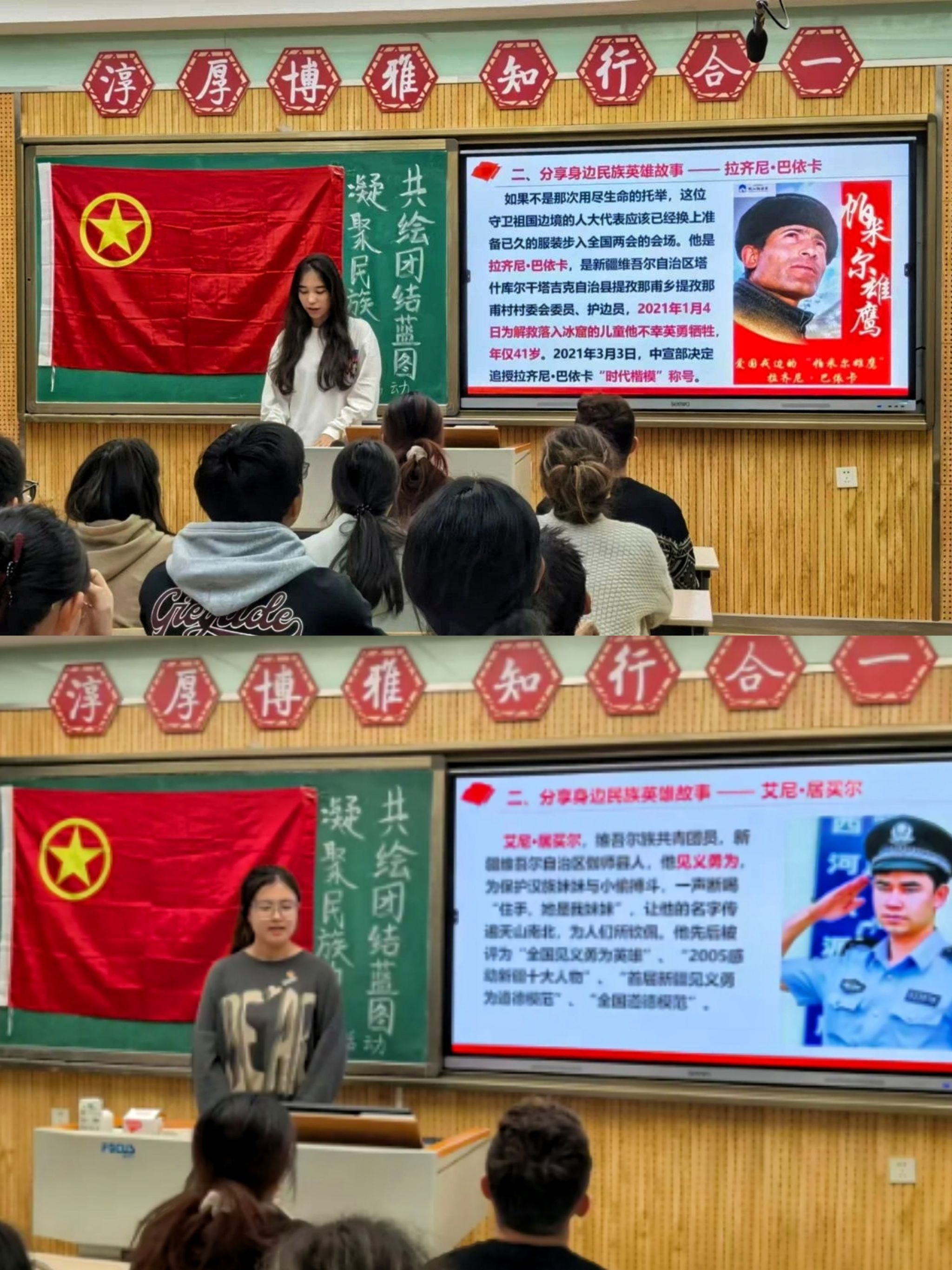 民族英雄故事分享环节,两位学生代表走上讲台,她们分享了各民族的动人故事和英雄事迹,包括拉齐尼·巴依卡和艾尼·居买尔的感人事迹,以及学校民族团结教育品牌——“石榴红”成长工程的实践成果。这些故事和成果,不仅加深了同学们对各民族文化的了解,更在他们心中种下了民族团结的种子,让大家真切感受到了中华民族大家庭的温暖和力量。