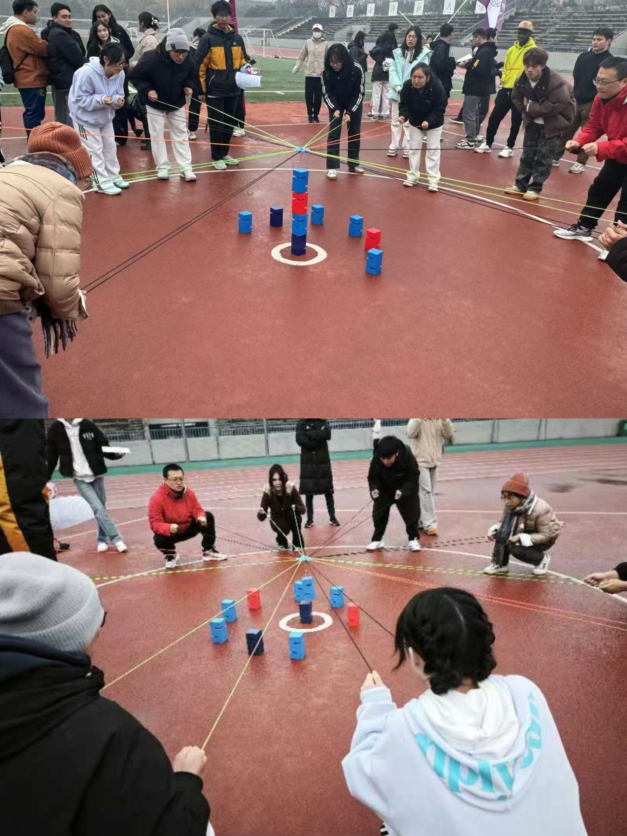接下来的图片依次是赛前热身、推铁环接力、背对背夹球接力、小绳单摇接力、击鼓颠球、合力筑塔、毛毛虫竞速。