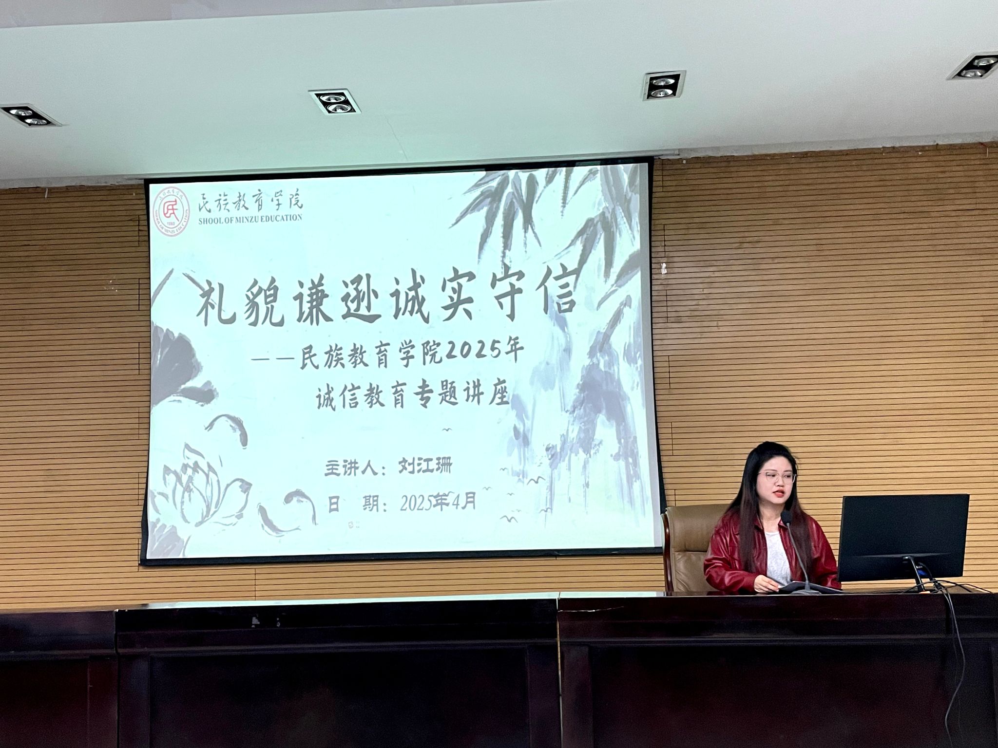学院组织学生参加由学院团委学生兼职副书记、兼职辅导员刘江珊主讲的大学生诚信专题教育讲座。讲座以“礼貌谦逊诚实守信”为主题,从诚信故事、诚信美德等方面展开详细讲解。通过讲述古代诚信故事,引导广大青年学生珍视诚信,以诚信修养品德,为学生们敲响诚信警钟,促使学生珍惜个人信用记录,增强在学习和生活中的诚信意识。