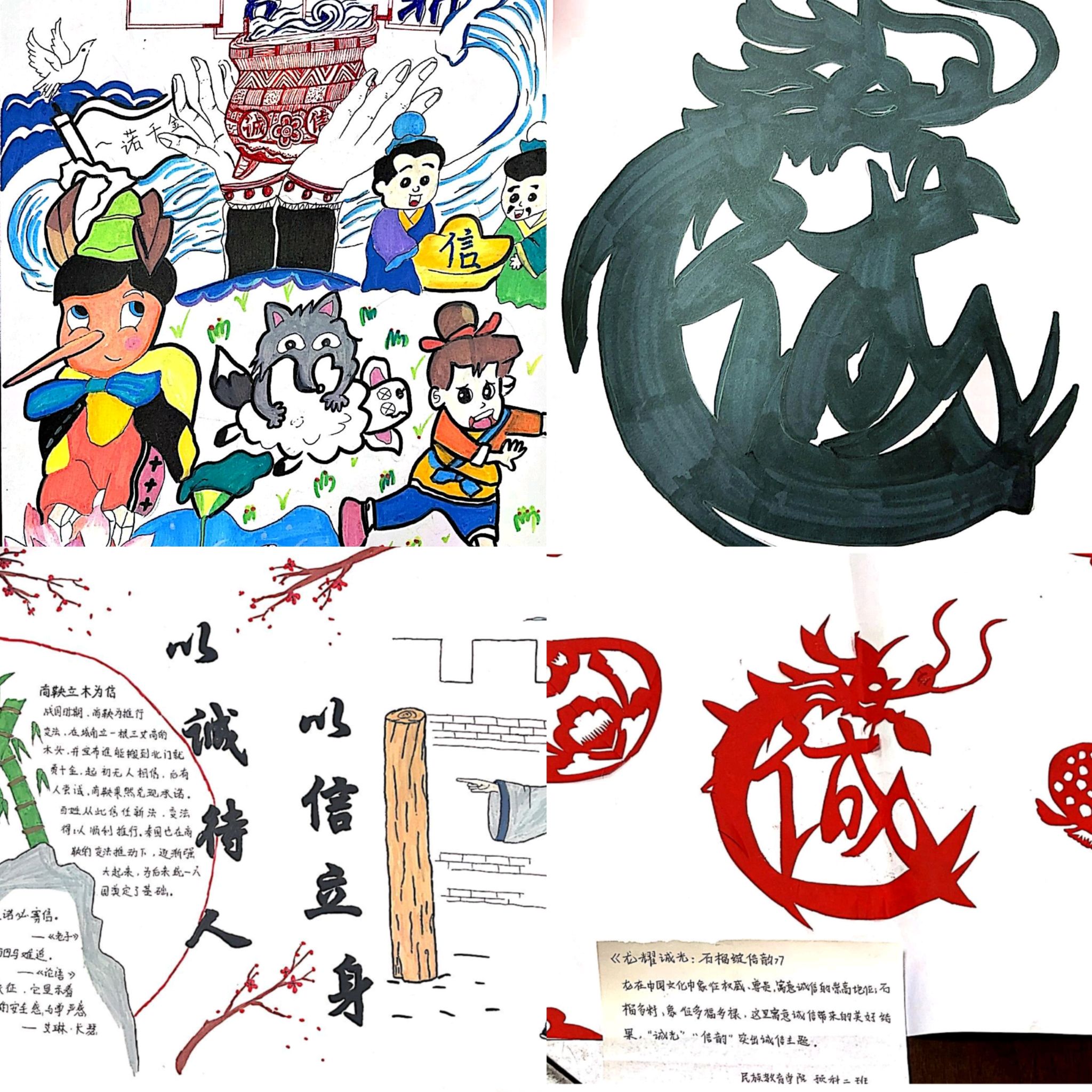 为充分激发学生的积极性,挖掘青年学生的想象力与创造力,引导学生传播守信正能量,学院同步开展了涵盖书法、绘画、海报、篆刻、剪纸、漫画等多种形式的诚信主题作品创作活动。活动一经推出,便得到全院学生的热烈响应,参与热情高涨,各类优秀作品层出不穷,引发广泛共鸣。此次活动共收到12名学生的创新作品。