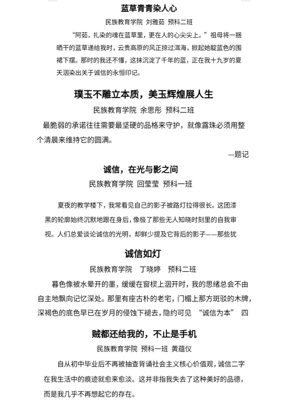 学院面向各班学生举办诚信主题征文活动,旨在引导学生自觉践行社会主义核心价值观,培养诚实守信、爱国爱校、勤奋好学的优秀品质,鼓励学生成为守信践诺的新时代好青年。学生们热情高涨,积极参与,创作出《让诚信之花在枝头绽放》《以诚信之笔 绘人生华章》等众多佳作。这些作品主题新颖、内容生动,赢得了学院师生的一致好评。本次征文活动共收到25名学生的稿件,学院从中精选5篇优秀征文推送至学校。
