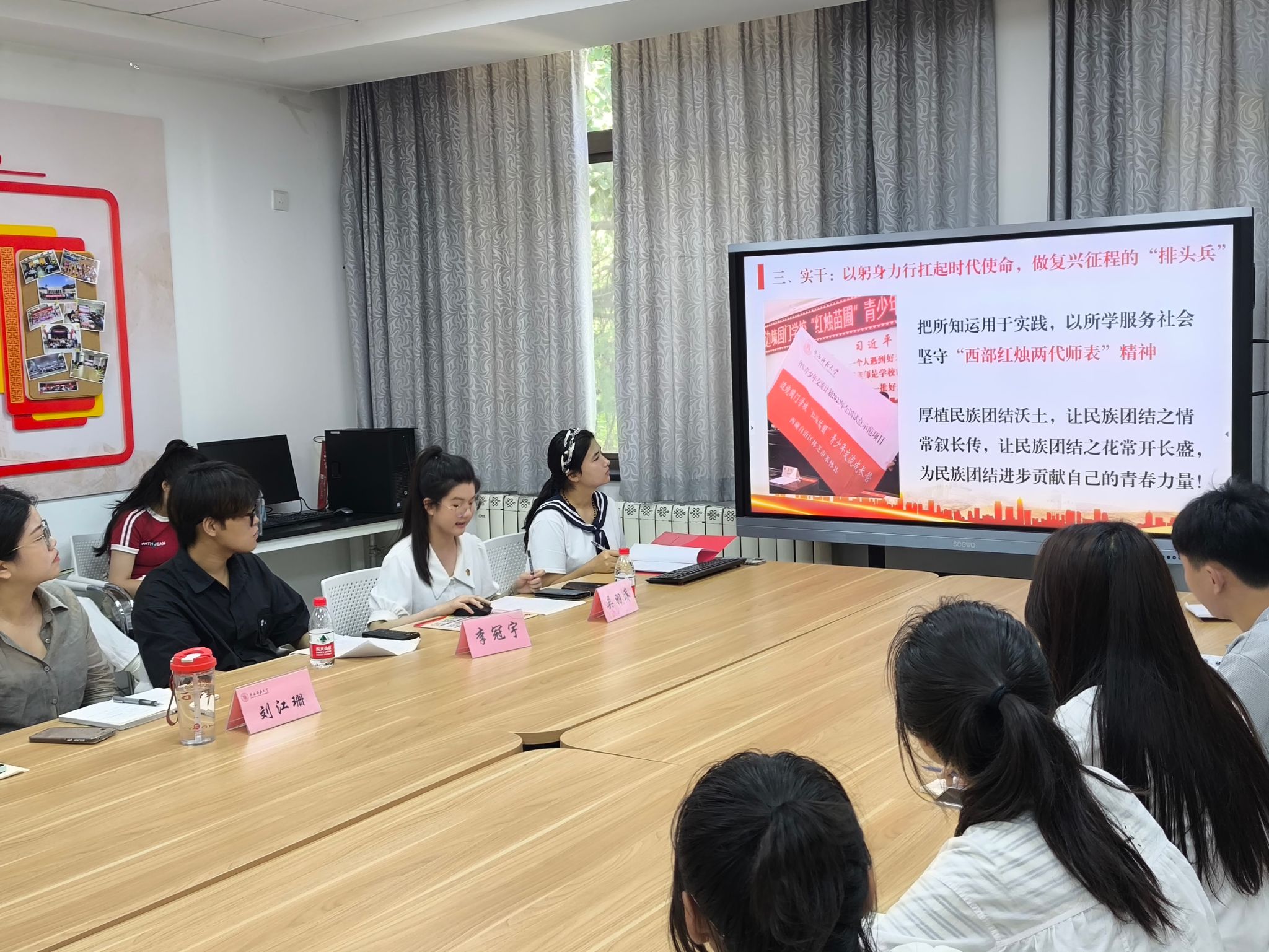 在雁塔校区六附楼305室组织开展以“同心聚力兴边疆,携手共筑中国梦”为主题的分享交流会。学校大学生马列理论读书社社长、马克思主义学院2021级本科生吴羽乔,马克思主义学院2021级本科生、思想政治教育(师范)专业2101班班长李冠宇,学院学生团委副书记、兼职辅导员刘江珊,学生骨干及各班级代表参与活动,会议由预科三班穆妮热·图尔荪主持。